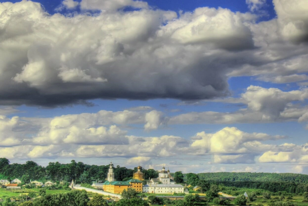Обитель окружена lush greenery деревьев и живописными холмами курской земли, что придаёт ей особую умиротворённость и покой. На переднем плане можно различить элементы благоустроенной территории и скромные строения, подчёркивающие аскетичный и молитвенный дух монашеской жизни. Свято-Николаевский Рыльский монастырь является одной из главных духовных твердынь региона, притягивающей паломников своей благодатной силой и намоленностью, а данный снимок прекрасно передаёт его величие и неземную красоту, гармонично вписанную в божественное творение природы.