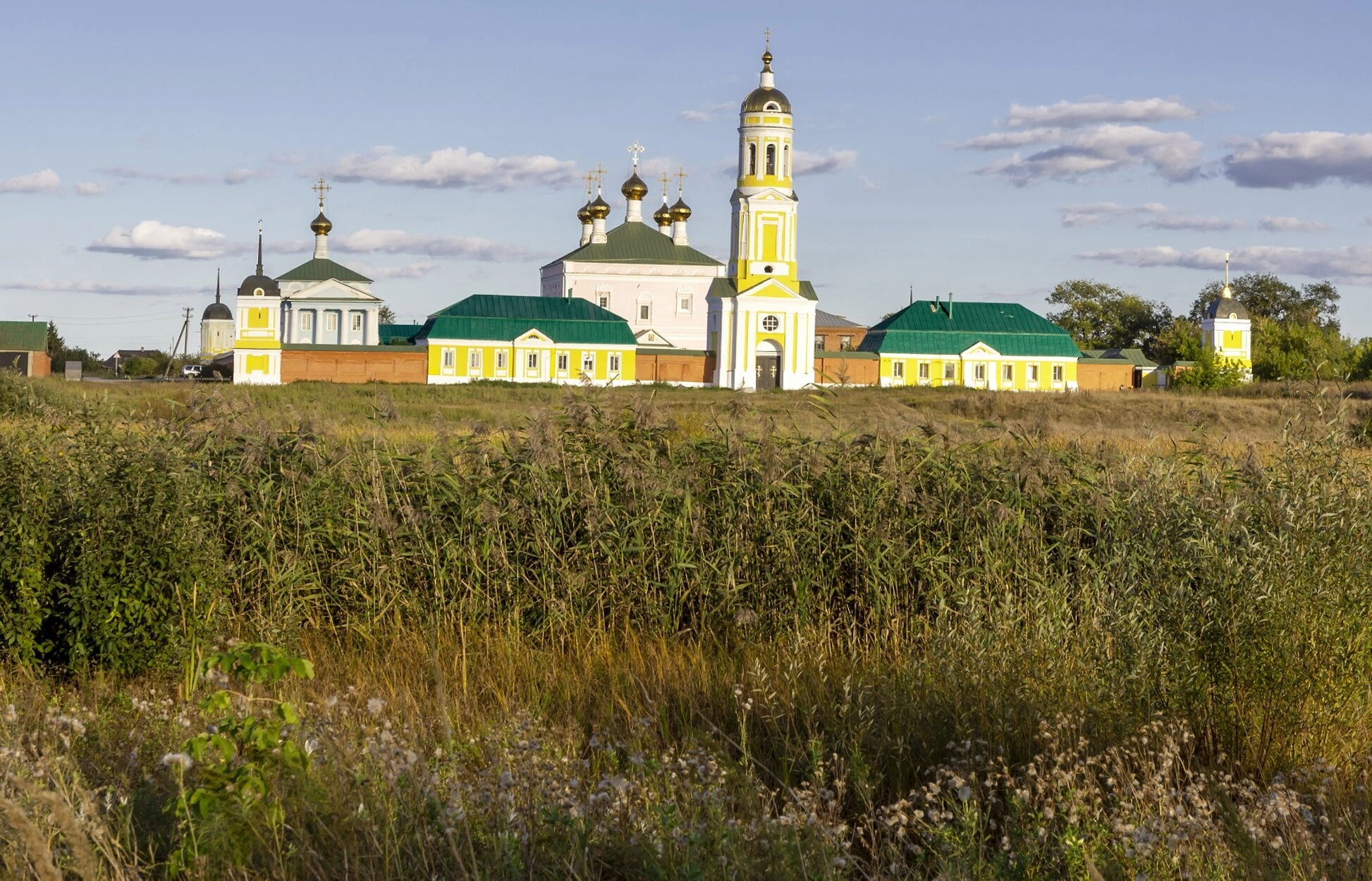 Архитектурный ансамбль монастыря, сияющий на снимке золотом куполов и яркими охристыми стенами, гармонично вписан в окружающий природный ландшафт. Центральное место в композиции занимает монументальный соборный храм, увенчанный традиционным пятиглавием. Рядом возвышается стройная колокольня, являющаяся смысловой доминантой всего комплекса. Зелёные кровли и наличники добавляют в цветовую палитру строений благородное разнообразие.