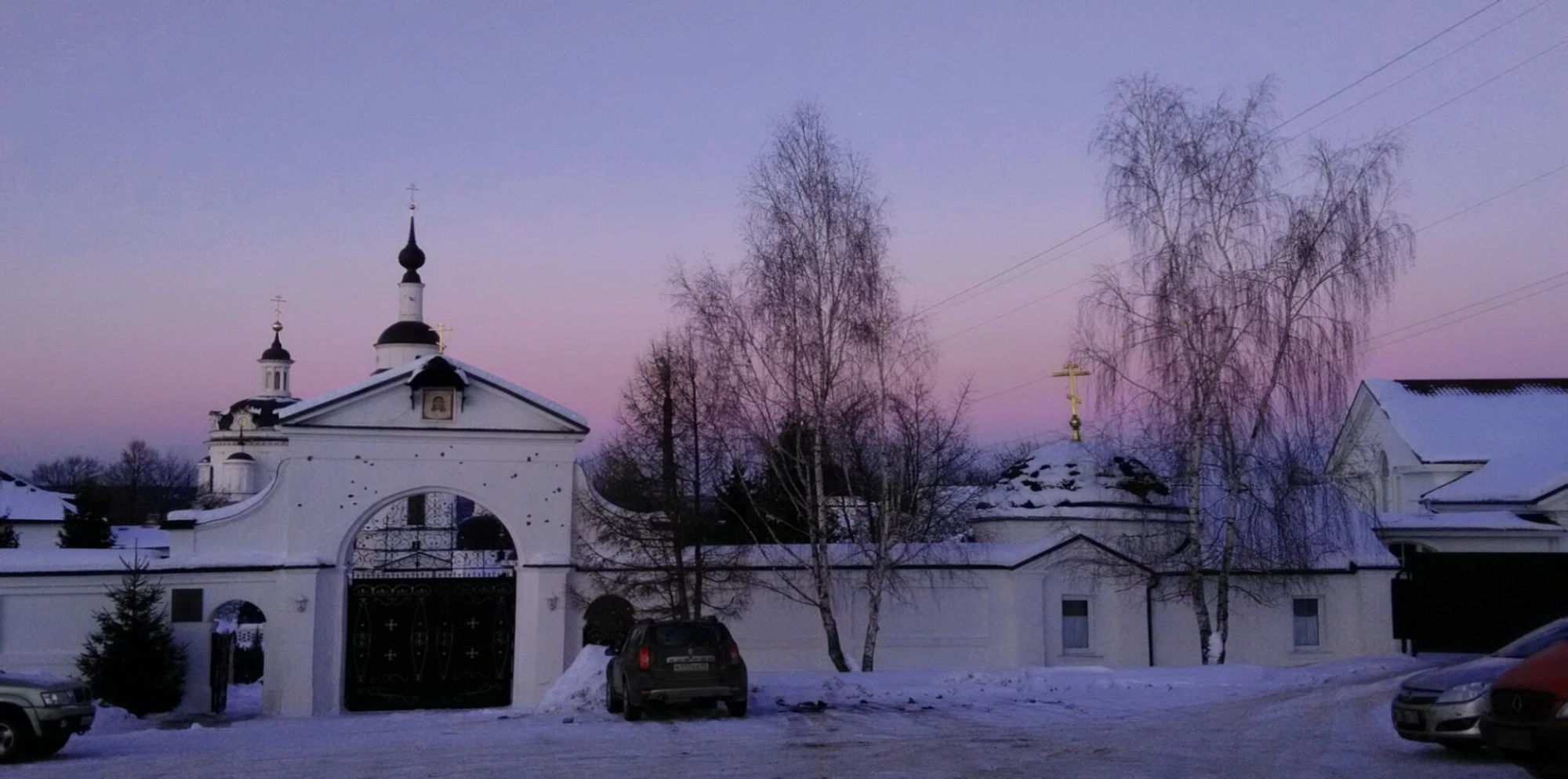 На переднем плане видны Святые врата монастыря, которые являются не только входом в обитель, но и символом перехода от мирской суеты к духовной жизни. Архитектурный ансамбль монастыря, включающий храмы и колокольни, выполнен в традициях русского церковного зодчества и гармонично вписывается в зимний пейзаж. Золочёные купола с воздвигнутыми на них крестами сияют в лучах неяркого солнца, напоминая о вечном и горнем.