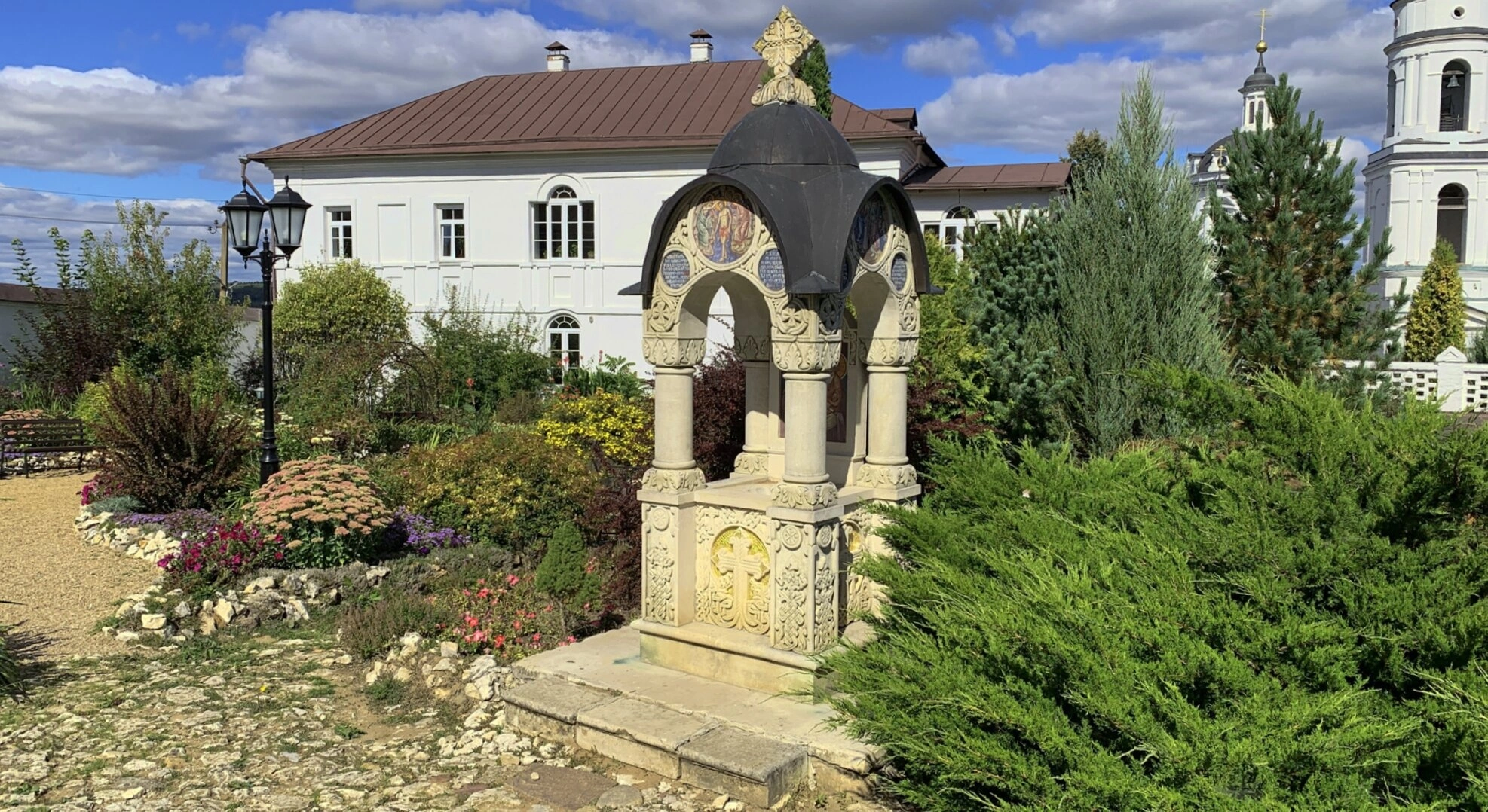Голубое небо с легкими облаками создает светлое настроение и подчеркивает благодатную атмосферу этого святого места. Вся композиция фотографии передает умиротворенность и духовную наполненность православной обители, являющейся важным центром духовной жизни Калужской земли.