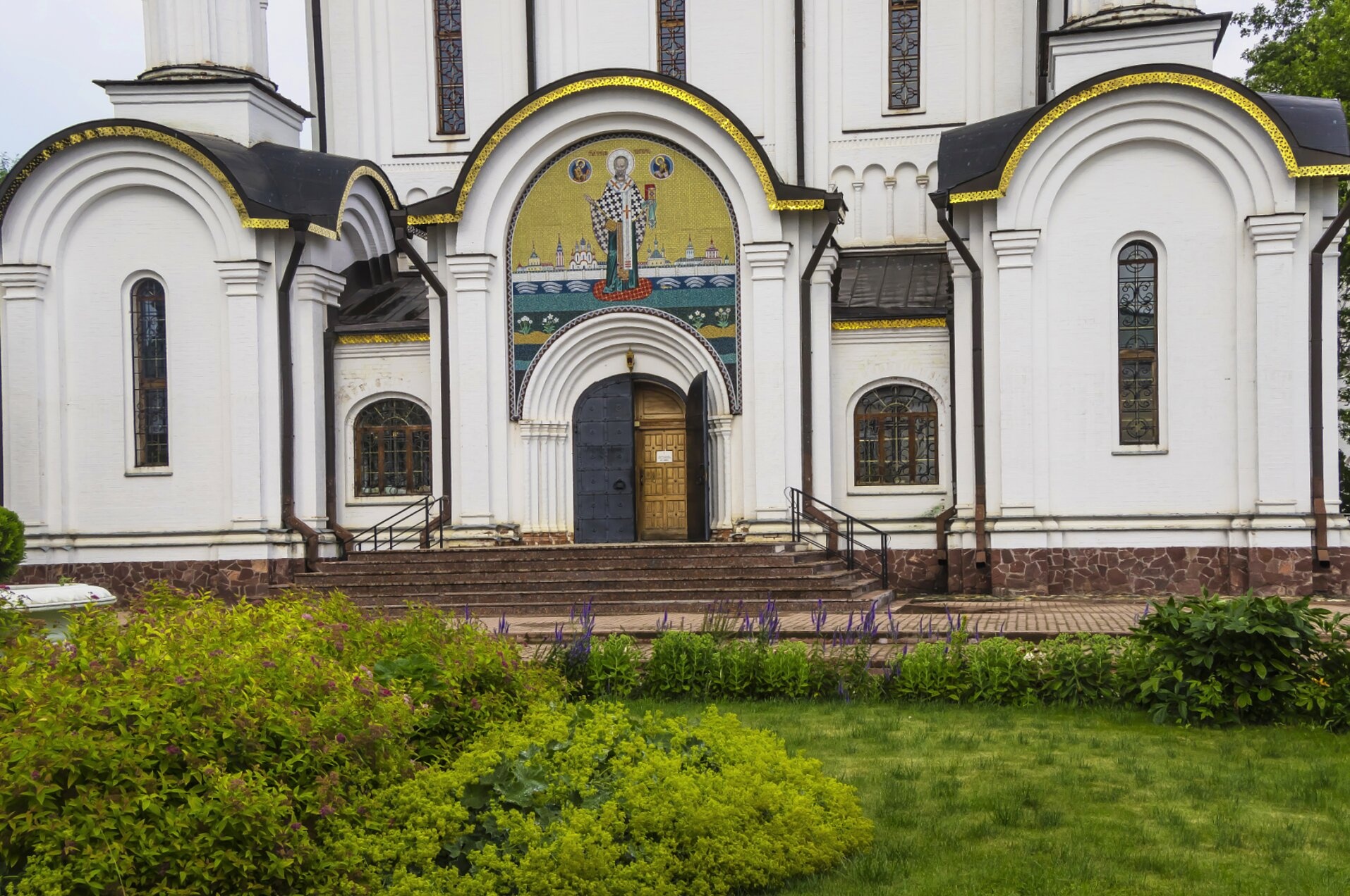 На представленной фотографии запечатлён величественный фасад главного собора Свято-Никольского монастыря в древнем граде Переславле-Залесском. Центральным элементом композиции является парадный вход в обитель, обрамлённый массивными деревянными дверями, символизирующими врата в духовную жизнь. Непосредственно над входом размещена прекрасная мозаичная икона, от которой веет благодатью и святостью.