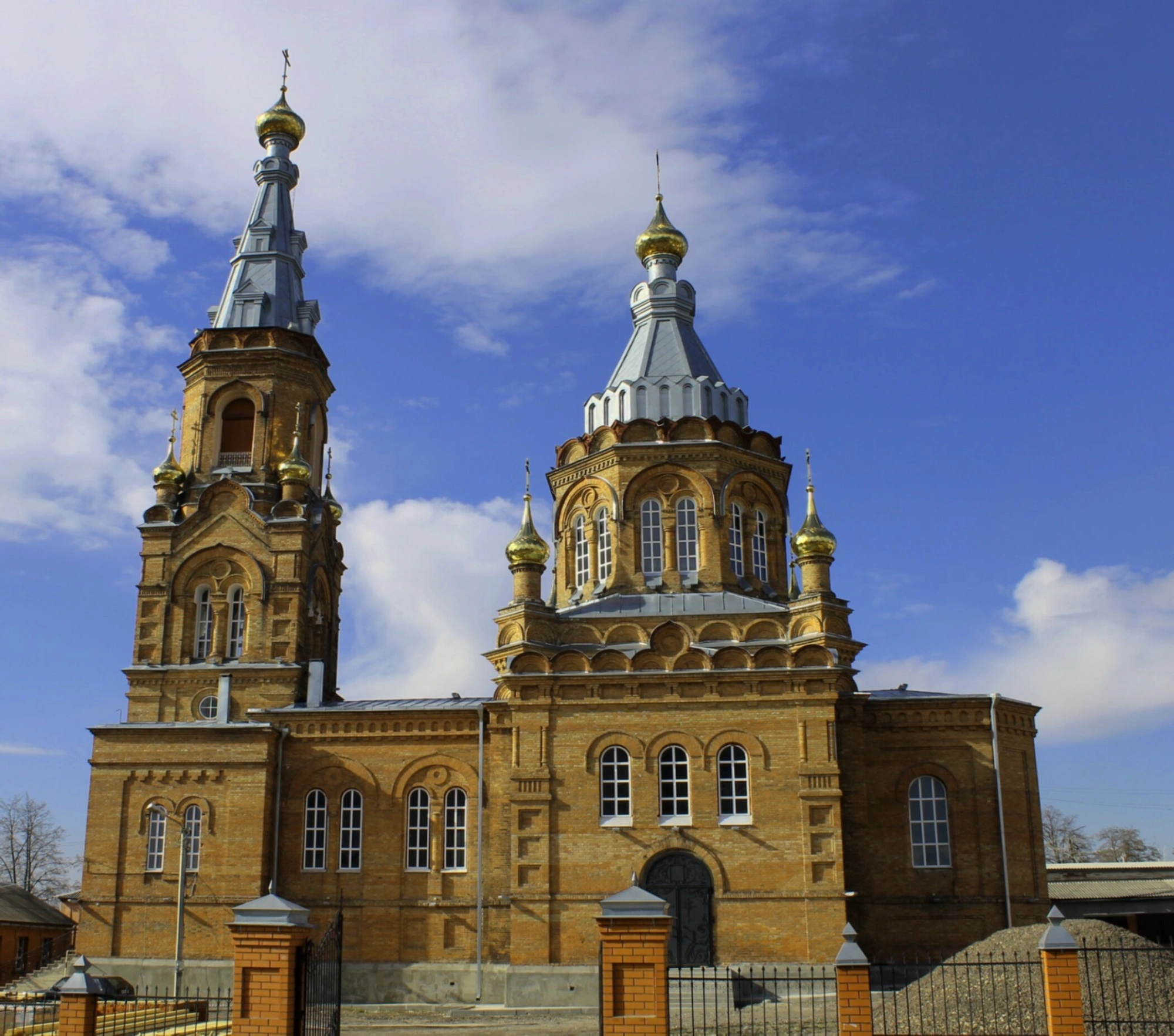 На представленной фотографии запечатлён величественный Свято-Никольский собор, расположенный в историческом центре города Льгова Курской области. Этот православный храм, освящённый во имя святителя Николая Чудотворца, является одной из главных духовных и архитектурных доминант города.