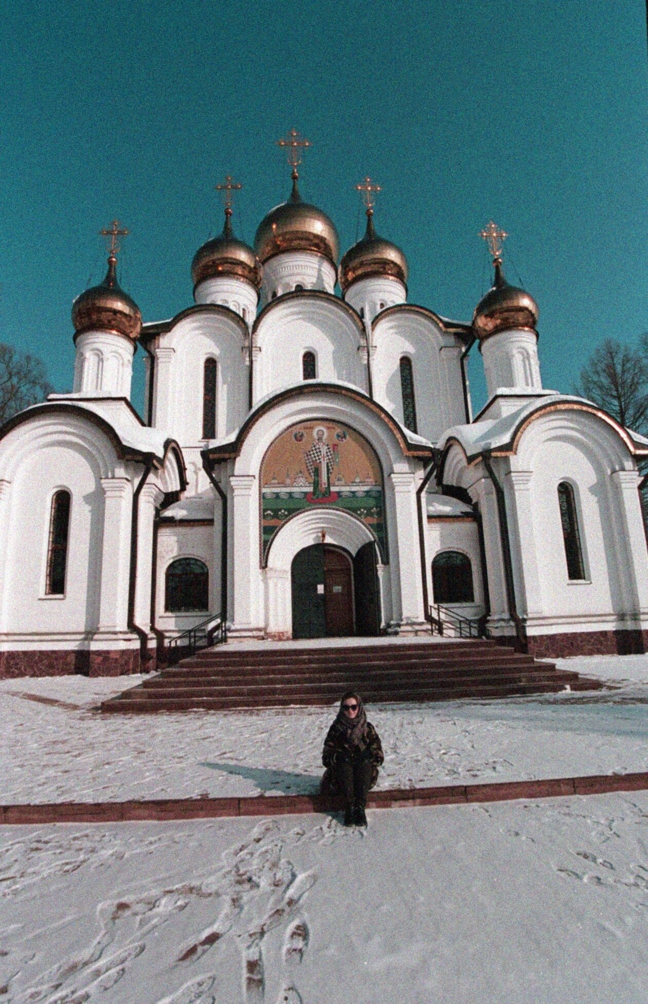 На представленной фотографии запечатлён величественный вид Свято-Никольского женского монастыря в древнем граде Переславле-Залесском в зимнее время. На переднем плане виден укрытый снегом монастырский двор, испещрённый тропинками, а в центре композиции — фигура человека в тёплой одежде, что придаёт снимку особый, лиричный и человечный масштаб.