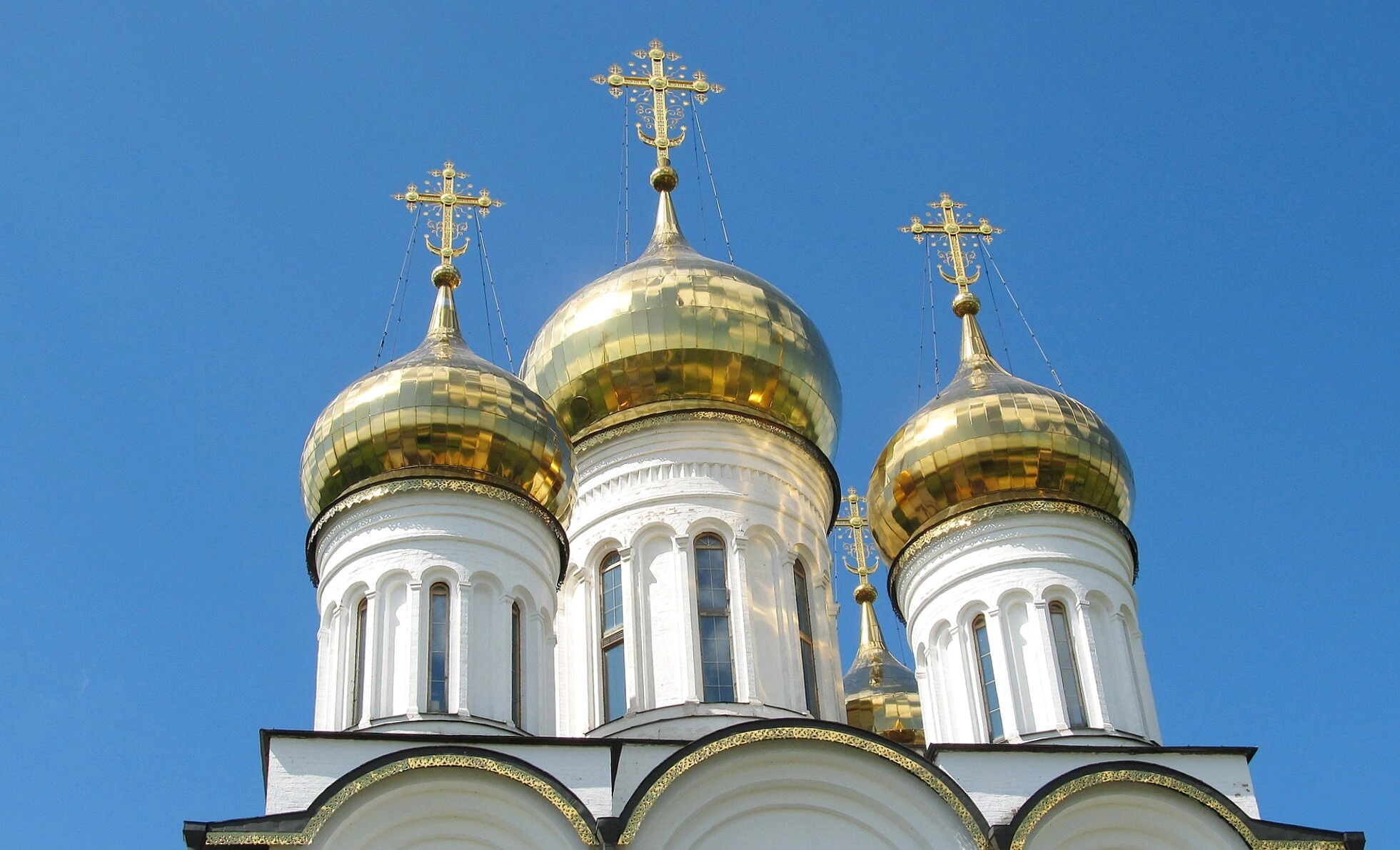 Главной доминантой монашатырского комплекса, чётко узнаваемой на снимке, является пятиглавый Никольский собор, возведённый в конце XIX века. Его ослепительно сияющие на солнце золотые купола-луковки, увенчанные ажурными крестами, и белоснежные стены создают яркий, праздничный образ, символизирующий чистоту и heavenly свет православной веры. Монументальный объём храма, его строгие и одновременно торжественные формы являются характерным примером русской церковной архитектуры периода эклектики.