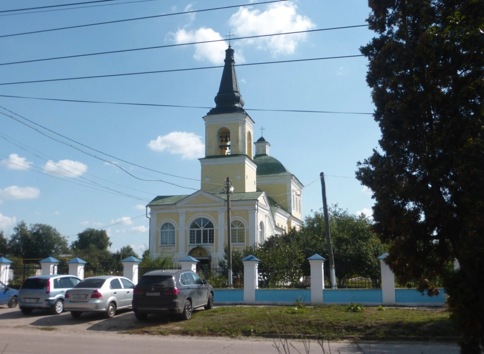 На переднем плане фотографии видны элементы благоустройства территории — ажурная ограда с синим основанием и белыми столбами, а также припаркованные автомобили, что свидетельствует о доступности храма для прихожан и паломников. Живописное окружение из зелёных насаждений и кустарников подчёркивает уединённость и благодатность этого места для молитвенного уединения. Снимок сделан в ясный день под безоблачным голубым небом, что наполняет образ храма божественным светом и благодатью.