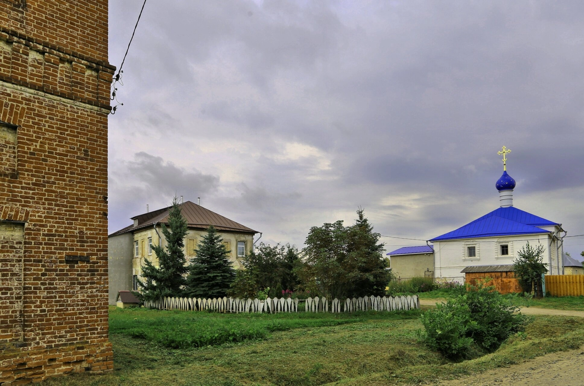 На переднем плане слева видна часть кирпичной монастырской постройки, возможно, хозяйственного или жилого назначения, что подчёркивает уединённый и строгий быт монашеской жизни. Территория обители обнесена традиционным деревянным забором, отделяющим мир духовный от мирского. Пышная зелёная трава и хвойные деревья, в числе которых узнаются туи, придают месту ухоженный и благолепный вид, создавая атмосферу тишины и молитвенного покоя.