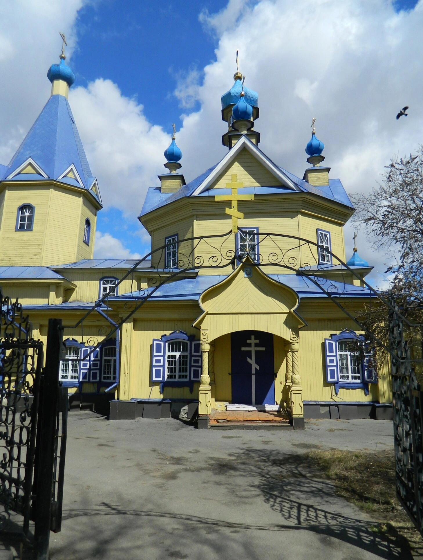 Фасад церкви, обращённый к молящимся, украшен арочными оконными проёмами и килевидными кокошниками, что придаёт всей постройке особую лёгкость и устремлённость ввысь. На переднем плане фотографии видны элементы ограды и ворота, которые обозначают вход на освящённую территорию храма — место отделённое от мирской суеты для молитвы и единения с Богом.