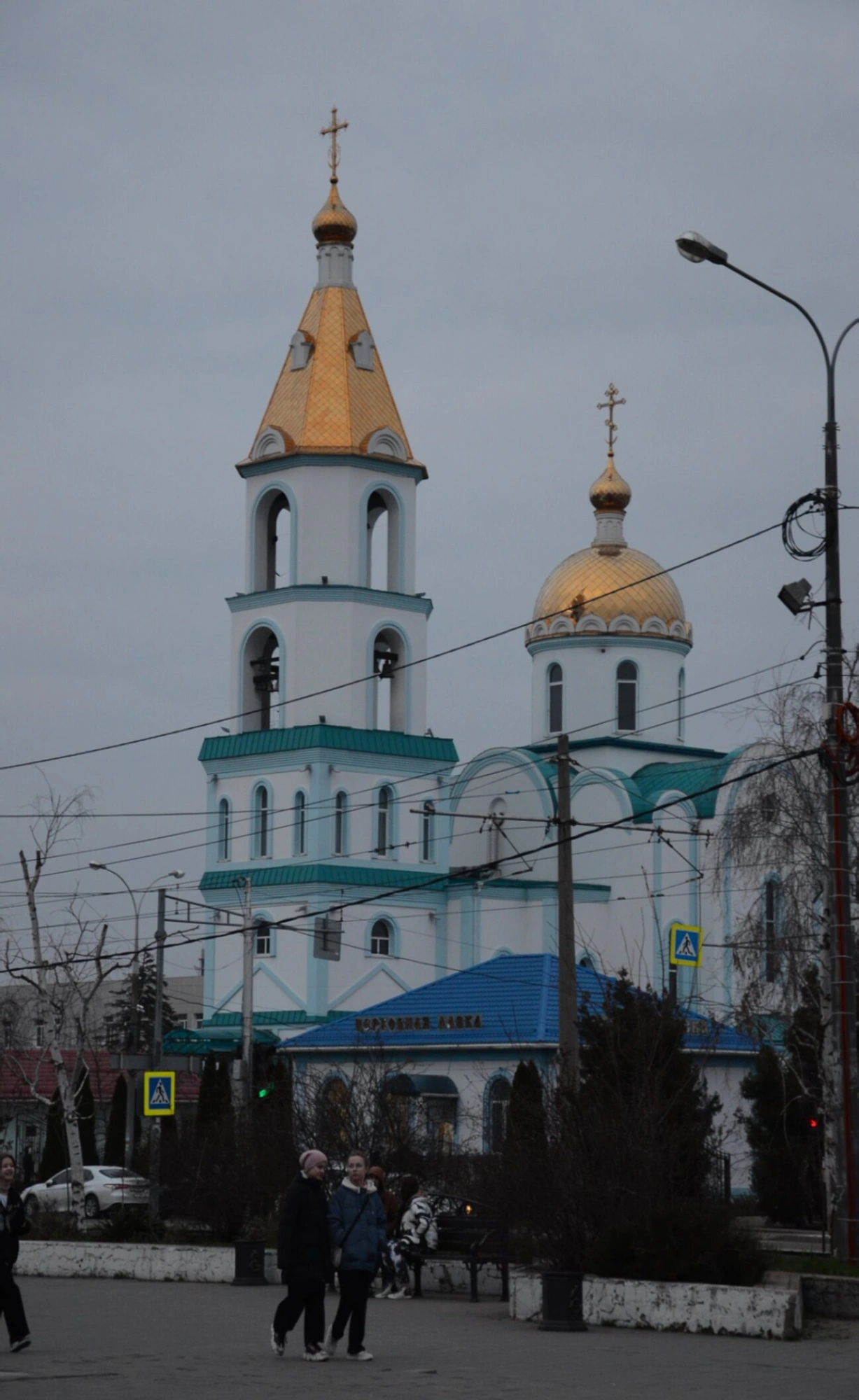 На представленной фотографии запечатлён Свято-Покровский храм города Краснодара — один из старейших и наиболее почитаемых православных приходов кубанской столицы. Белоснежные стены и лазурные купола церкви, увенчанные златоглавыми крестами, создают образ небесной чистоты и благодати, устремлённой ввысь.