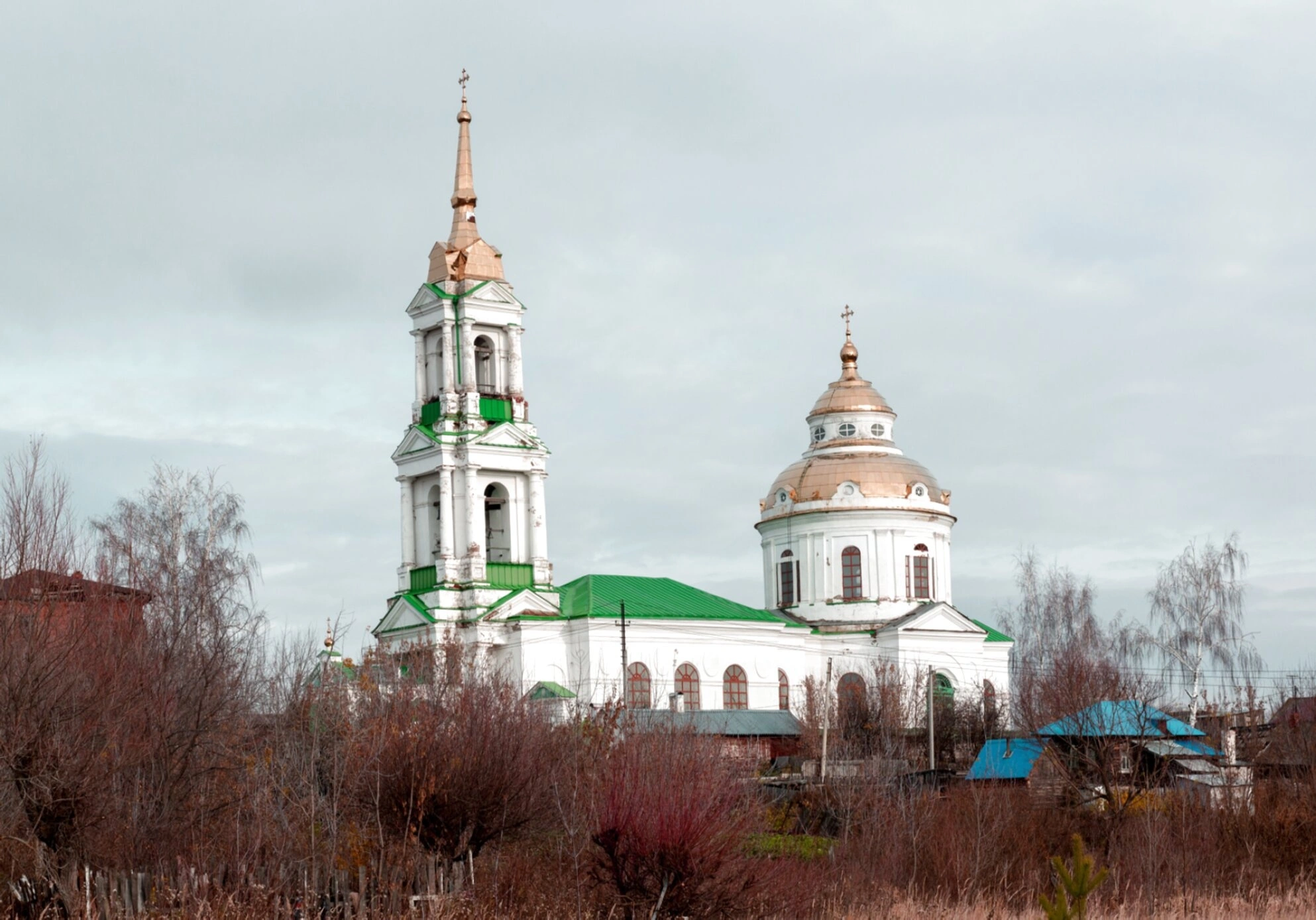На представленной фотографии запечатлён величественный Свято-Покровский собор, являющийся одной из архитектурных и духовных доминант исторического центра города Елабуги. Этот кафедральный собор был возведён в период с 1813 по 1820 год на средства благотворителей и усердием православной общины города как выражение глубокой веры и благодарности Господу за избавление Отечества от нашествия иноплеменников.