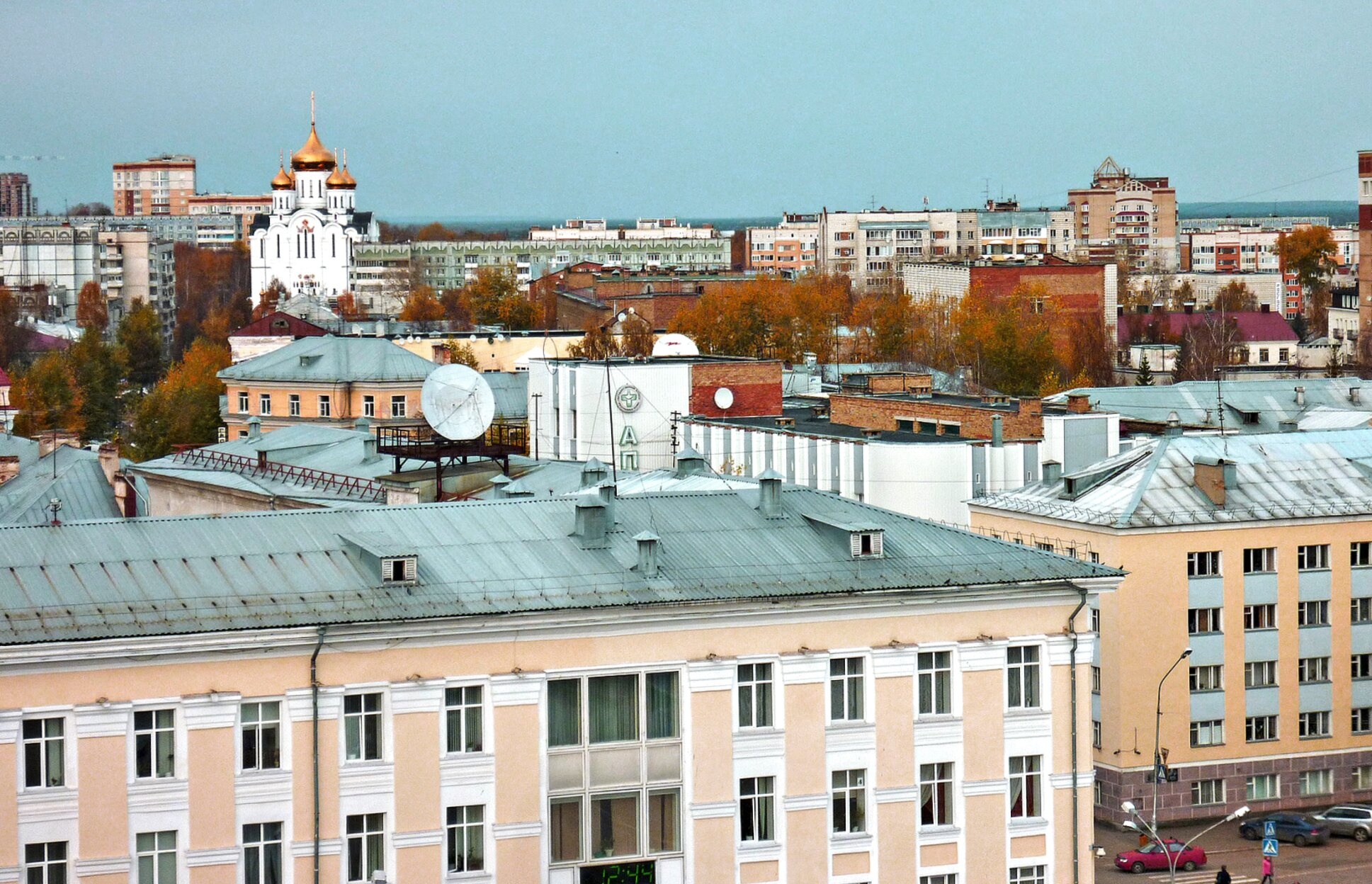 На представленной фотографии запечатлён величественный панорамный вид столицы Республики Коми — города Сыктывкара. Архитектурной и духовной доминантой пейзажа, возвышающейся над городской застройкой, предстаёт Свято-Стефановский кафедральный собор, освящённый в честь святителя Стефана Пермского, просветителя зырян. Его сияющие золотые купола и кресты, устремлённые в небо, видны из многих точек города и являются символом православной веры на этой земле.