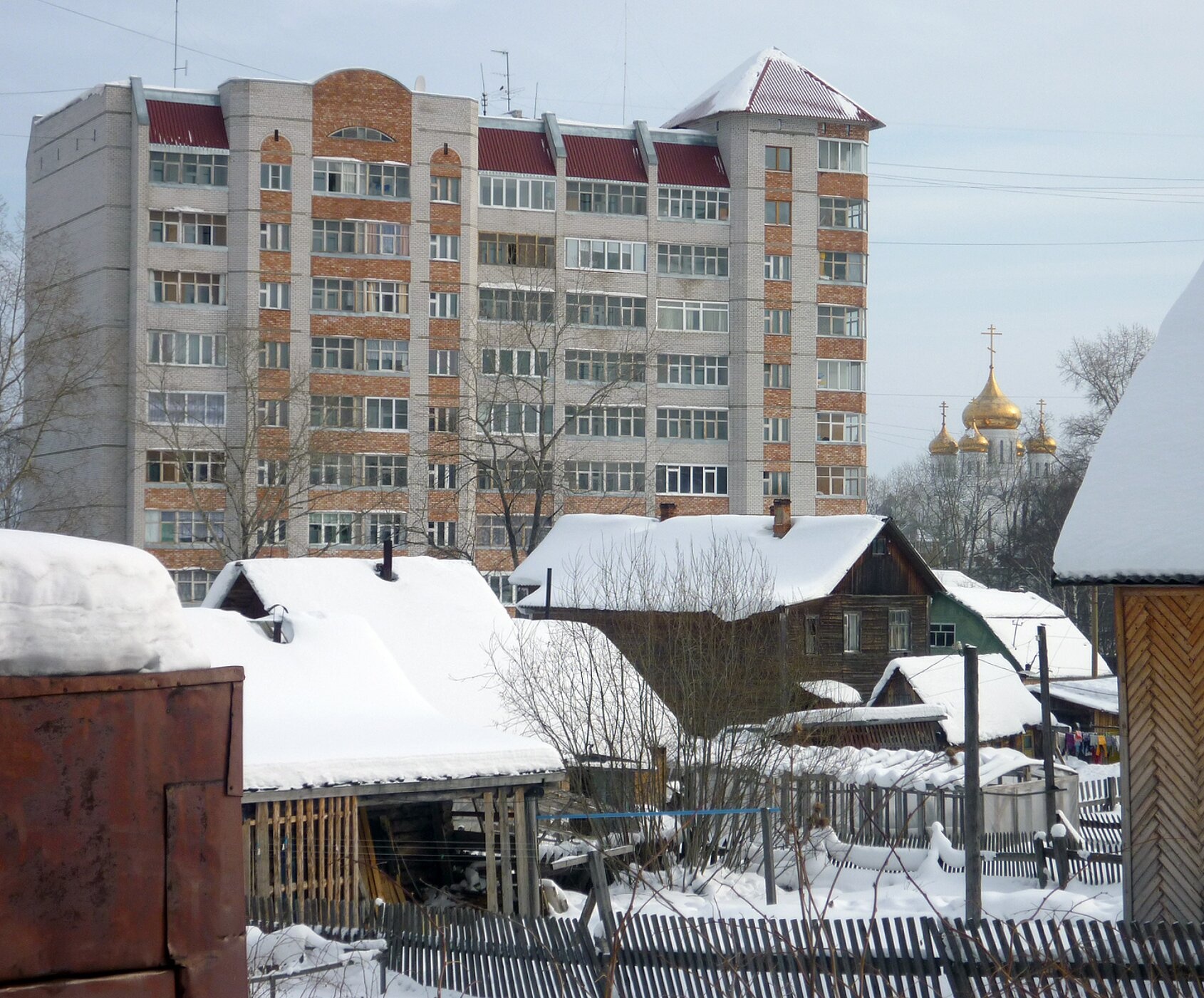 На представленной фотографии запечатлена зимняя панорама столицы Республики Коми — города Сыктывкара. На переднем плане видны укрытые снегом частные домовладения с традиционными деревянными заборами, создающие атмосферу уюта и покоя. Центральным элементом архитектурной композиции на заднем плане является величественное многоэтажное здание, однако истинной доминантой и духовным центром, приковывающим взор, выступает Свято-Стефановский кафедральный собор, чьи златоверхие главы сияют в зимнем воздухе.