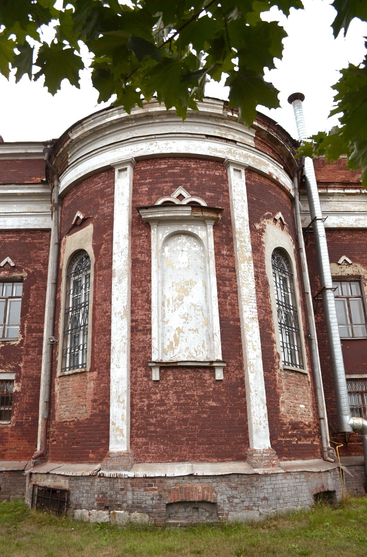 Архитектура храма гармонично сочетает элементы классицизма и традиционные русские церковные формы. На снимке хорошо просматривается характерная для храма полукруглая апсида, в которой располагается алтарная часть. Высокие арочные окна, украшенные скромными наличниками, предназначены для наполнения внутреннего пространства обильным естественным светом, что символизирует Божественное просвещение. Фасад из красного кирпича, местами сохранивший следы штукатурки, свидетельствует о почтенном возрасте святыни и требует благоговейного отношения к её сохранности.