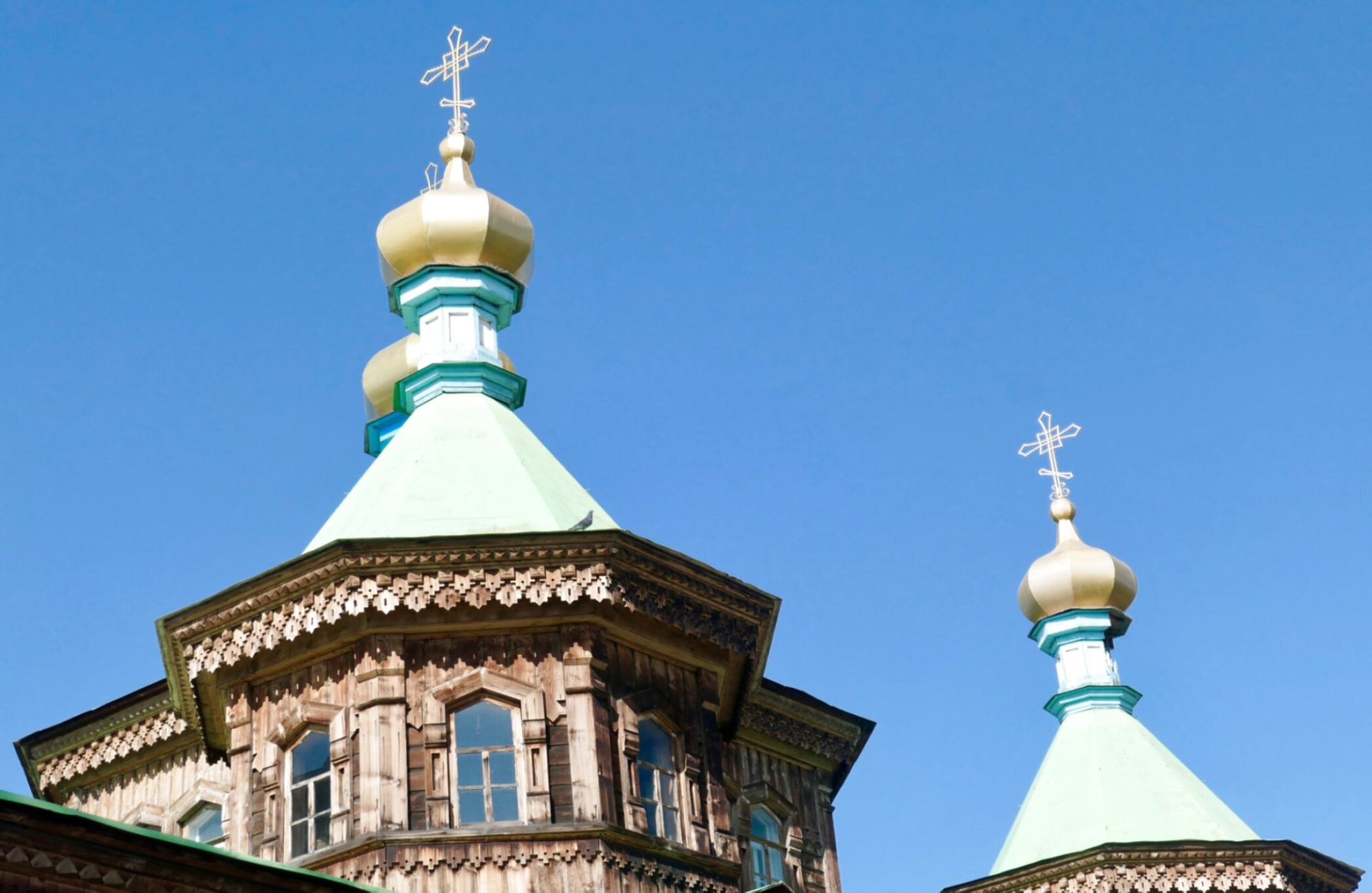 На представленной фотографии запечатлён величественный облик Свято-Троицкой церкви, находящейся в городе Каракол (Кыргызстан). Этот православный храм, освящённый во имя Живоначальной Троицы, является выдающимся памятником русского деревянного зодчества и одной из главных духовных святынь региона.