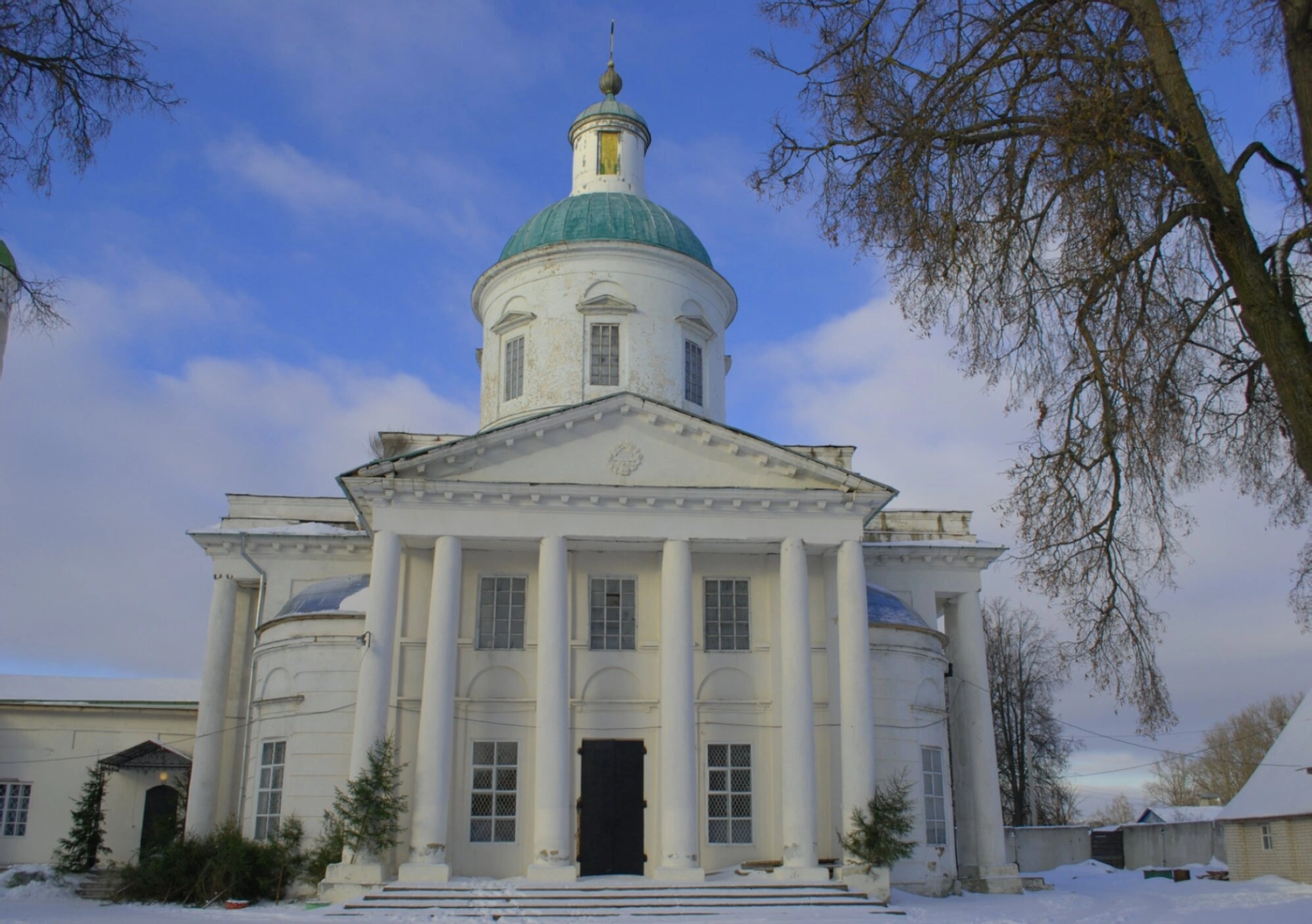 На представленной фотографии запечатлён величественный образец православного зодчества — храм во имя Святой Живоначальной Троицы в городе Кондрово Калужской области. Белоснежный храм, возведённый в лучших традициях классицизма, предстаёт в зимнем убранстве, что придаёт его облику особую, возвышенную строгость и чистоту.