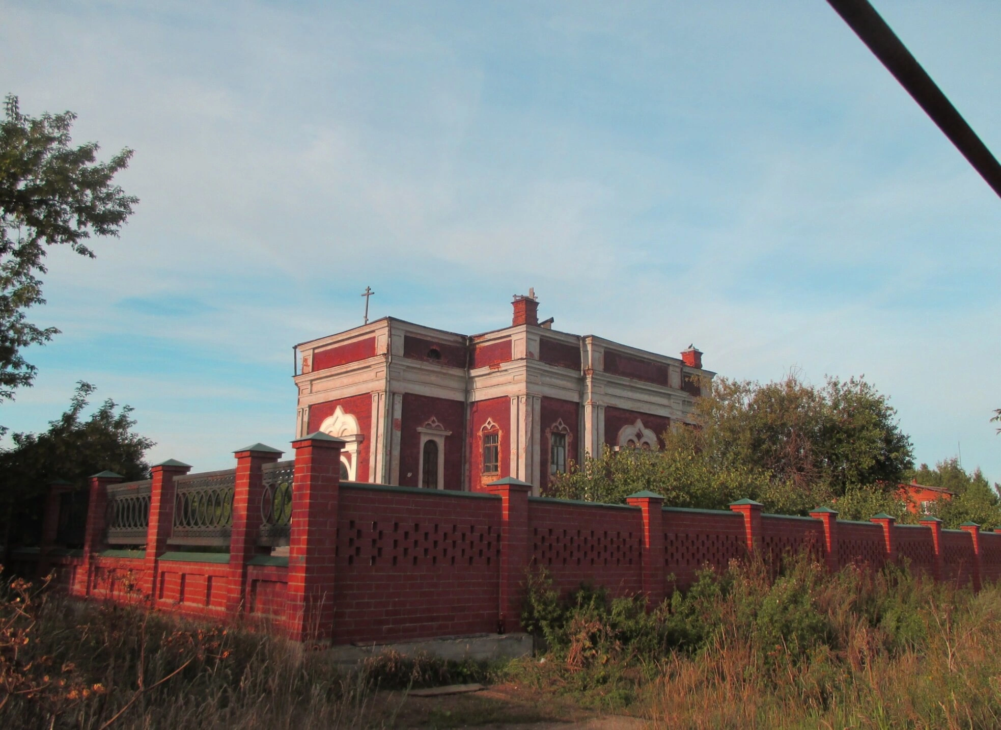 На снимке здание храма предстаёт в своём величии, выполненное из красного кирпича с изящными белыми декоративными элементами. Архитектурное решение храма относится к эклектике, где гармонично переплетаются элементы классицизма и традиционного русского церковного зодчества. Фасад украшен фигурными наличниками, карнизами и пилястрами, что придаёт ему торжественный и нарядный вид. Над основной частью здания возвышается световой барабан, увенчанный золочёной главкой с крестом, символизирующим победу Господа над смертью.