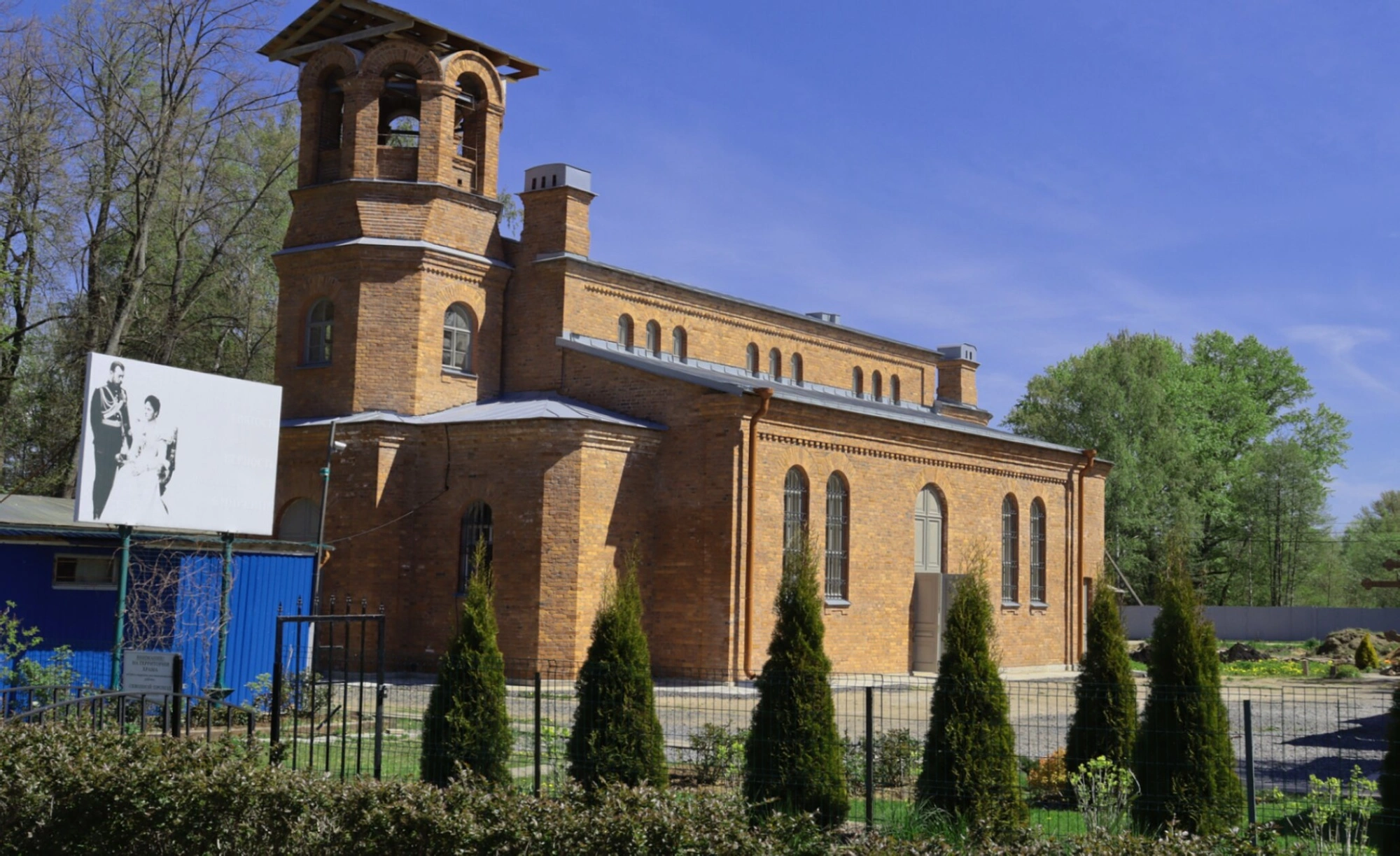 Перед святым фасадом располагается ухоженная территория, где высажены аккуратные хвойные насаждения, символизирующие вечную жизнь и укрепляющие молитвенную атмосферу этого места. Низкое ограждение обозначает границу церковного участка, не скрывая его красоты от благочестивых паломников и жителей города.