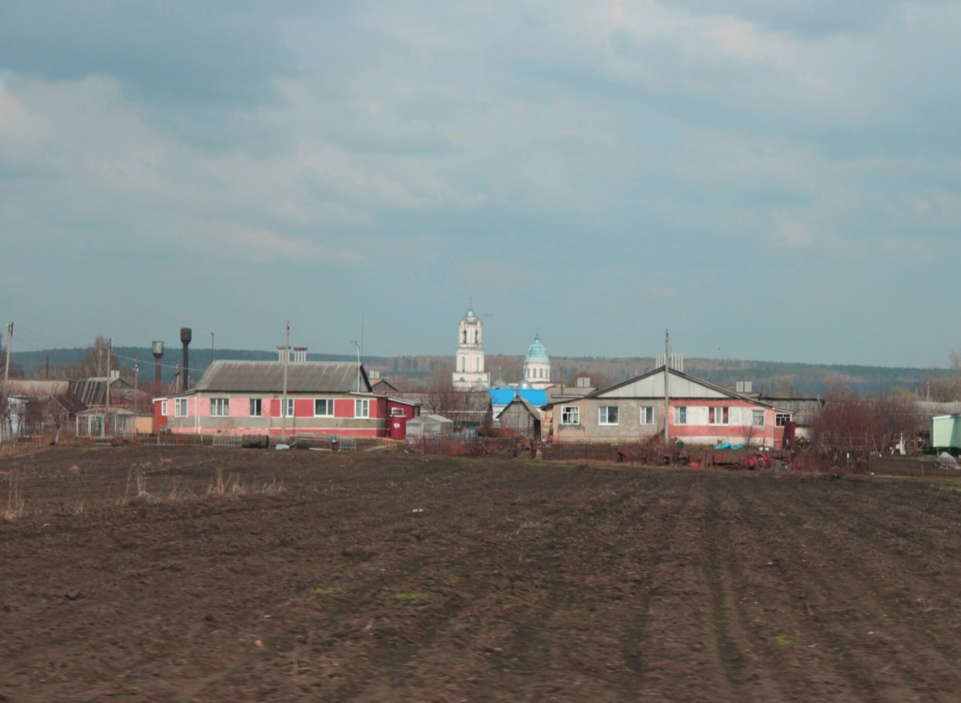 На переднем плане изображено тёмное вспаханное поле, знаменующее собой благие труды и жизненный уклад местных жителей, неразрывно связанный с землёй. Средний план заполняют скромные деревенские дома и хозяйственные постройки, составляющие единое целое с храмом, что подчёркивает неразрывную духовную связь общины и места её молитвенного поклонения.