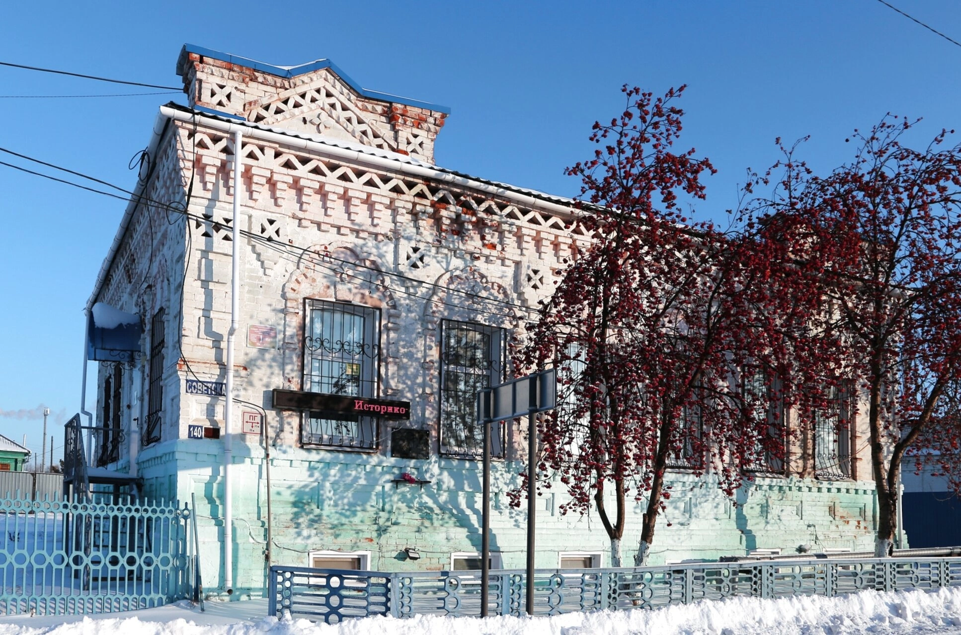 На фотографии запечатлён зимний пейзаж, покрытые снегом крыша и земля создают атмосферу умиротворения и духовного сосредоточения. Перед храмом виднеется синий металлический забор, а справа от здания произрастают деревья с алыми ягодами, добавляющие цветовой акцент в зимний пейзаж.