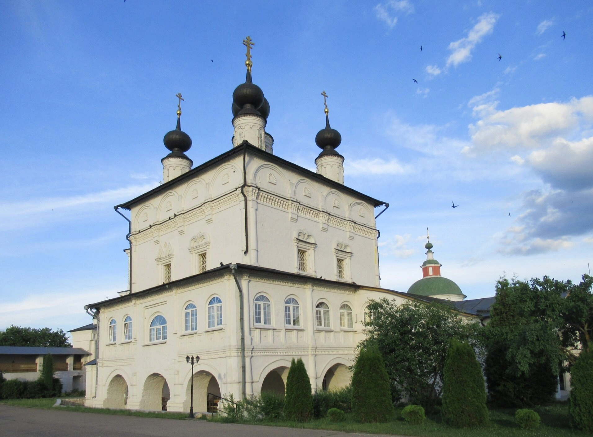 Центральным элементом композиции выступает Собор во имя Святой Живоначальной Троицы – величественный белокаменный храм, увенчанный несколькими главами с золочёными крестами. Архитектура собора демонстрирует характерные черты русского церковного зодчества: арочные галереи нижнего яруса, изящные оконные проёмы верхнего уровня и гармоничные пропорции всего сооружения.