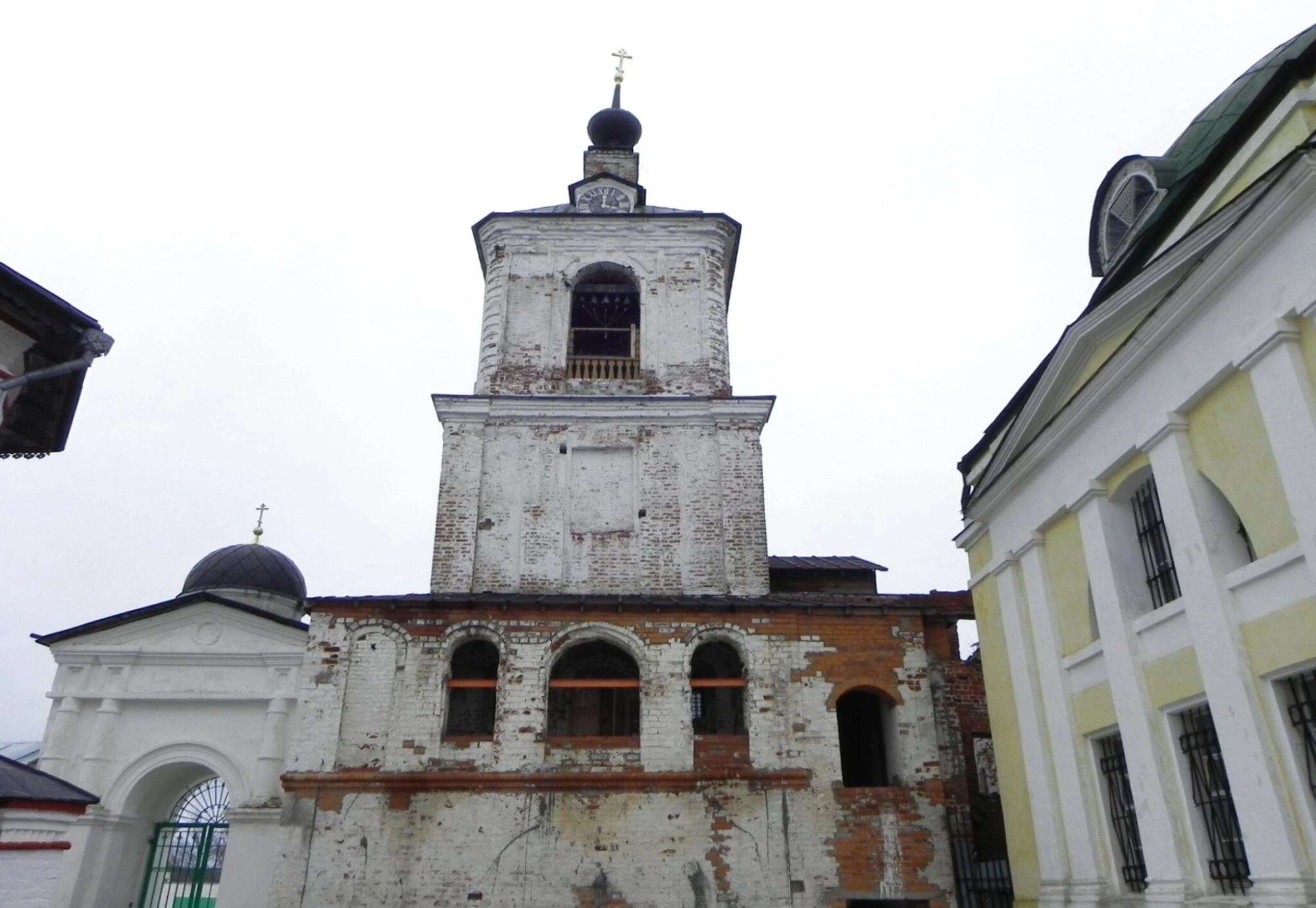 На снимке особенно выделяется монументальная колокольня с золочёным куполом и воздвигнутым на нём крестом, являющаяся архитектурной доминантой всей монастырской композиции. Колокольня, возведённая в традициях русского зодчества, представляет собой многоярусное сооружение, гармонично сочетающееся с другими строениями обители. Рядом виднеются фрагменты крепостных стен и зданий, выполненные из красного кирпича с элементами белокаменного декора, что характерно для церковной архитектуры XVI-XIX веков.