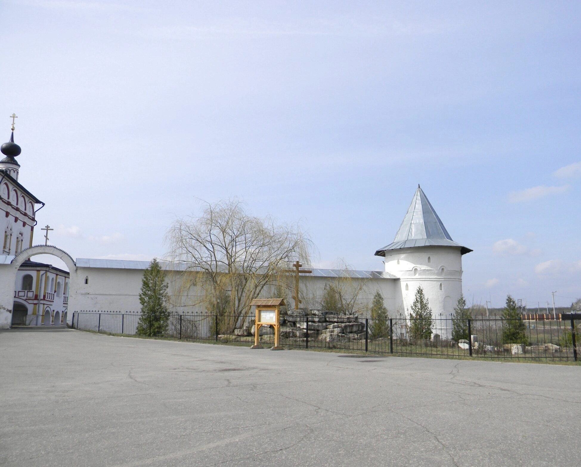 На снимке изображён фрагмент монастырской ограды с мощной белокаменной крепостной стеной и одной из сторожевых башен, увенчанной шатром. За стеной видны тёмные купола Собора Троицы Живоначальной — главного храма обители. Присутствующее на переднем плане деревянное распятие, установленное на каменном основании, является поклонным крестом, символизирующим искупительную жертву Спасителя и освящающим место для молитвы.