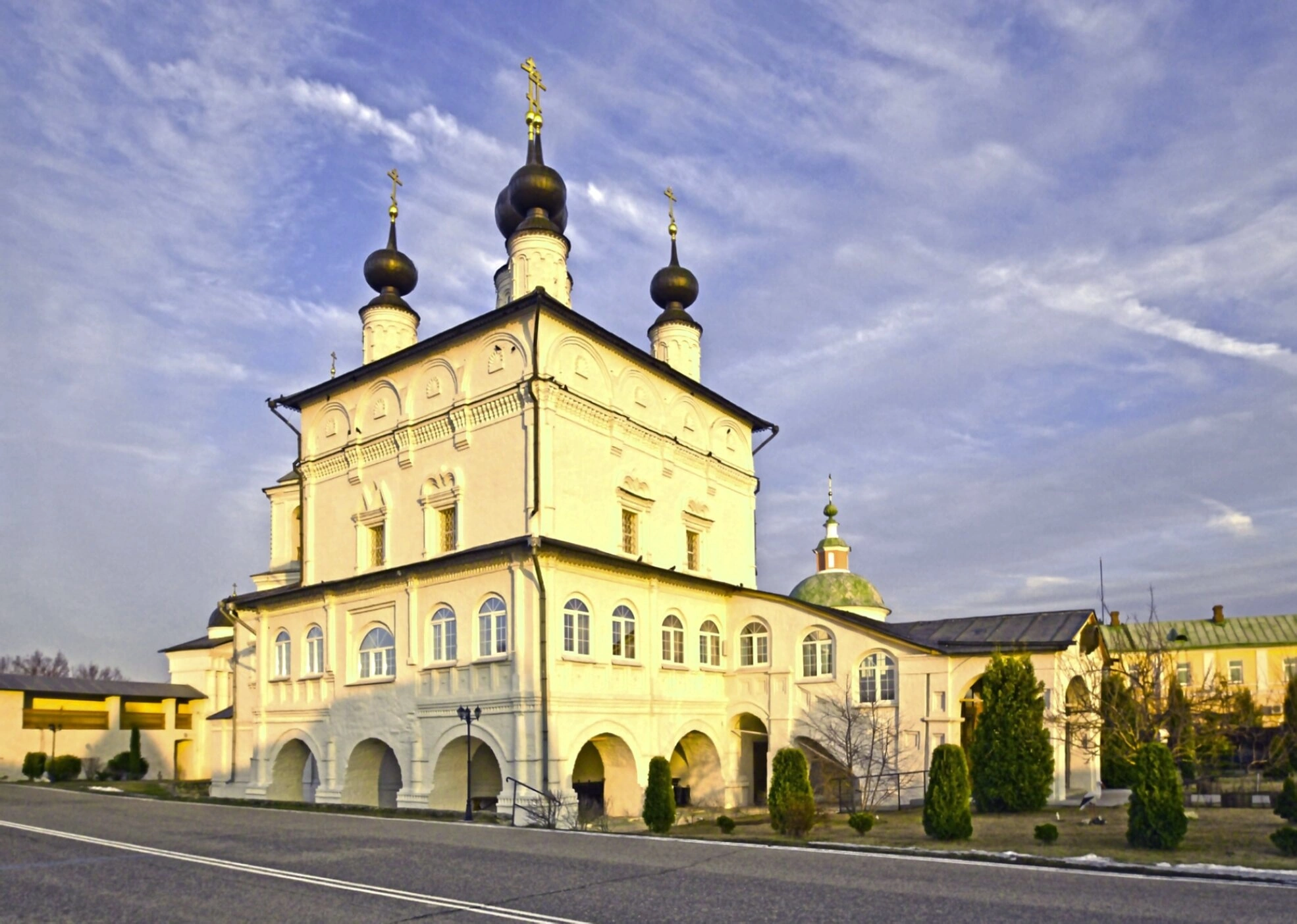 Перед собором видна монастырская дорога, а ухоженная территория с зелёными насаждениями и деревьями свидетельствует о заботе насельниц о своей святой обители. Фотография передаёт не только внешнюю красоту архитектурного памятника, но и ту особую, молитвенную атмосферу умиротворения и благодати, которая неизменно ощущается в этом намоленном месте на берегу древней реки Оки.
