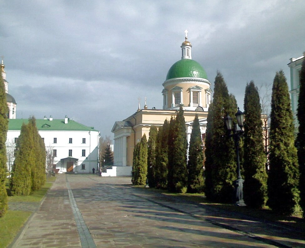 На фотографии хорошо просматривается архитектурная гармония и монументальность храма, являющегося духовным и архитектурным центром всей монастырской территории. В советские годы монастырь, как и многие другие святыни, был закрыт и разорён, а на его территории размещались различные светские учреждения. Однако в 1980-х годах обитель была возвращена Русской Православной Церкви и стала первым монастырём, открытым в СССР после десятилетий гонений.