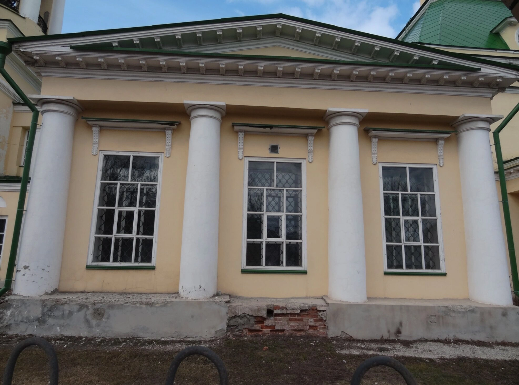 В нижней части фасада просматривается цокольный этаж, сложенный из природного камня, что придаёт сооружению ощущение монументальности и прочности. Выше оконных проёмов можно заметить лаконичные прямоугольные ниши, которые, вероятно, выполняют роль декоративных элементов, оживляющих плоскость стены. Завершает композицию зелёная кровля, традиционная для русских храмов и усадебных построек XVIII-XIX веков.