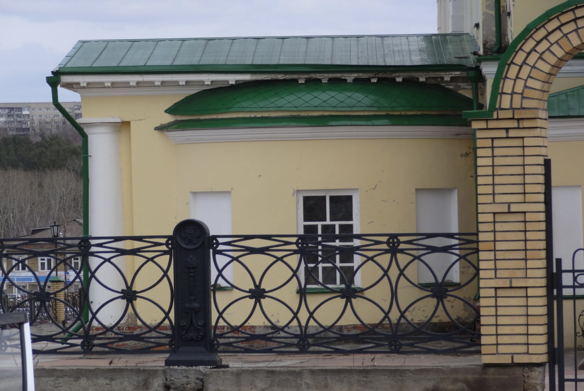 Перед святым местом установлено ажурное кованое ограждение, выполняющее не только защитную, но и глубоко символическую функцию. Декоративные элементы в виде переплетающихся кругов олицетворяют вечность и неразрывную связь горнего и дольнего миров. Это ограждение отделяет мирскую суету от пространства молитвы и тишины, приглашая верующих переступить порог дома Божия.