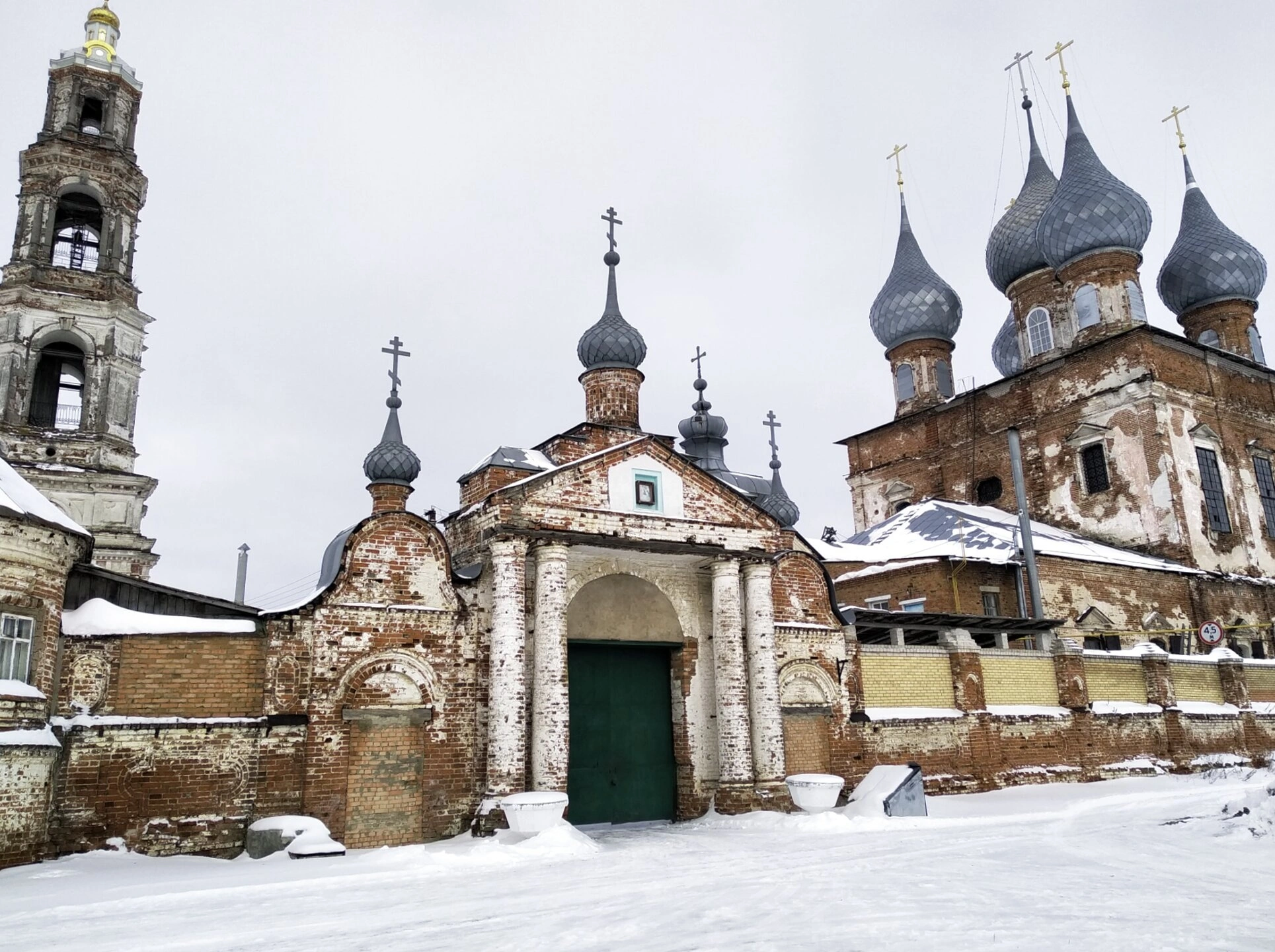 На фотографии запечатлен Свято-Троицкий храм в селе Васильевское Шуйского района Ивановской области — действующий православный храм, находящийся в процессе восстановления. Этот памятник церковной архитектуры, основанный в 1768 году, представляет собой пятиглавый четырехстолпный храм, выдержанный в традициях соборных храмов XVII века, с трехчастной апсидой, трапезной и монументальным крытым крыльцом.