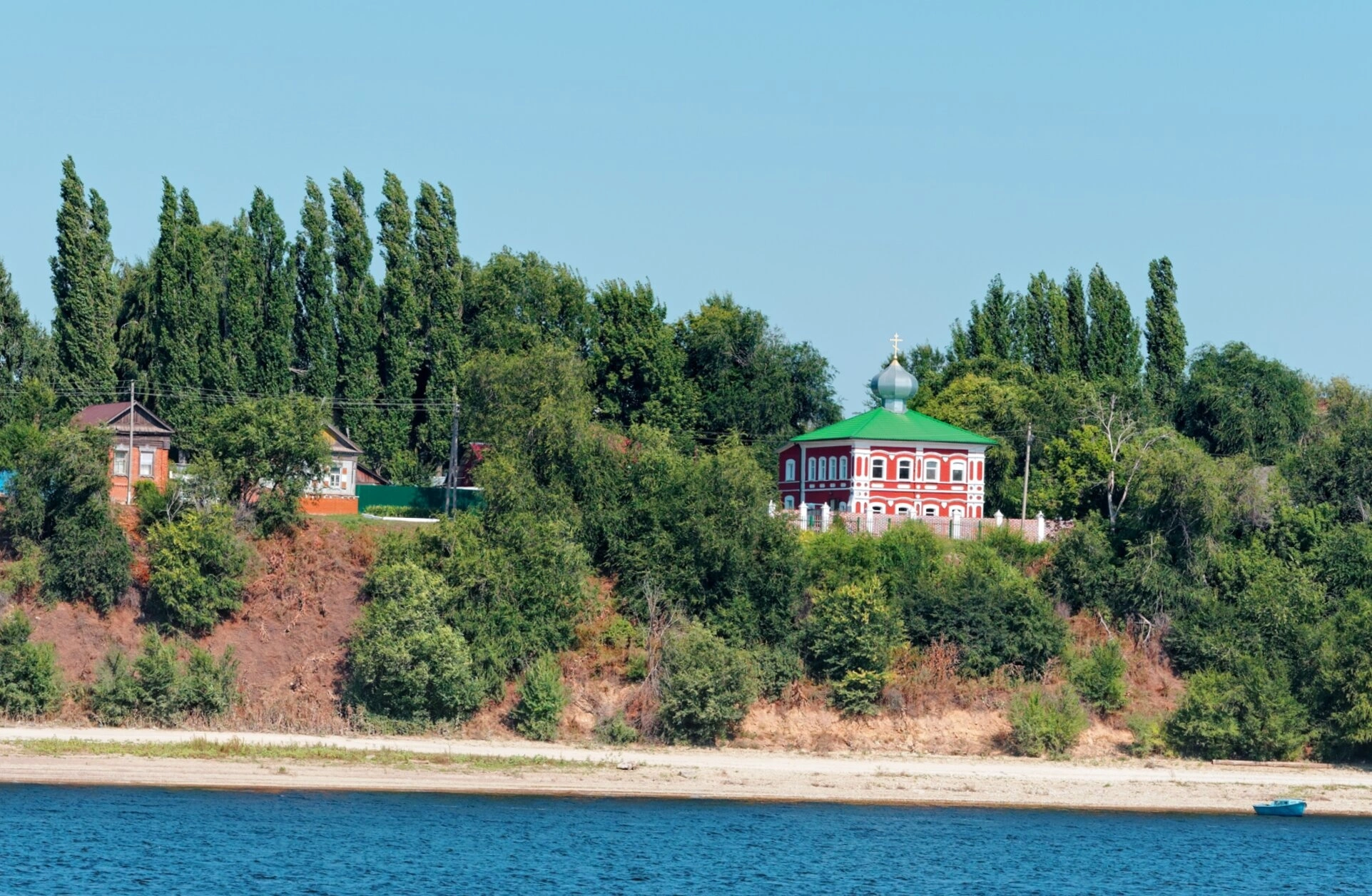 Фотография передаёт спокойствие и умиротворение этого святого места, где небо встречается с водой, а молитва продолжает жить среди просторов Поволжья.