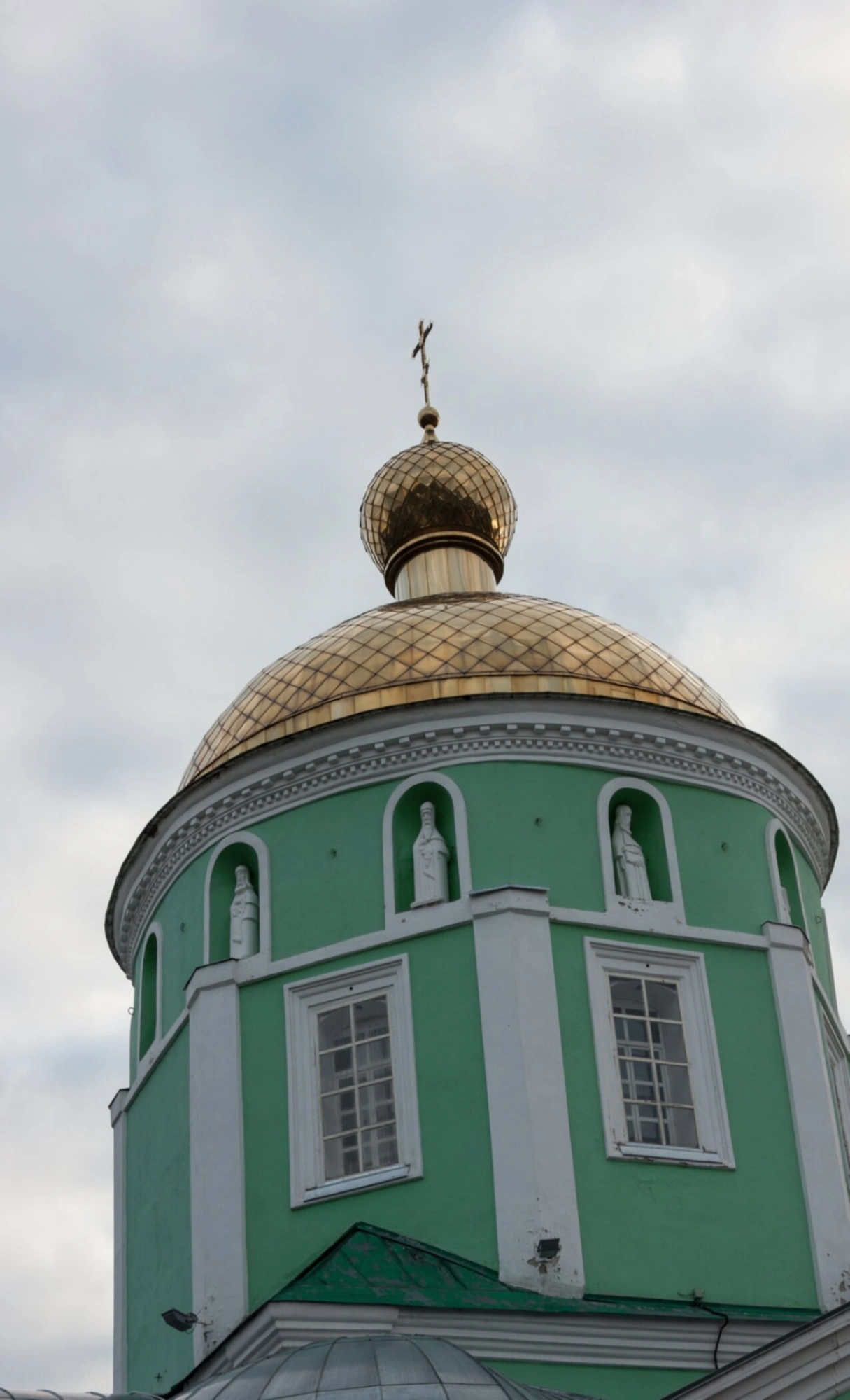 На фотографии запечатлён величественный золотой купол и верхняя часть Свято-Троицкого храма, расположенного в слободе Стрелецкой города Старый Оскол. Этот старинный православный храм, освящённый во имя Живоначальной Троицы, является одним из древнейших в Старооскольском крае и объектом культурного наследия.