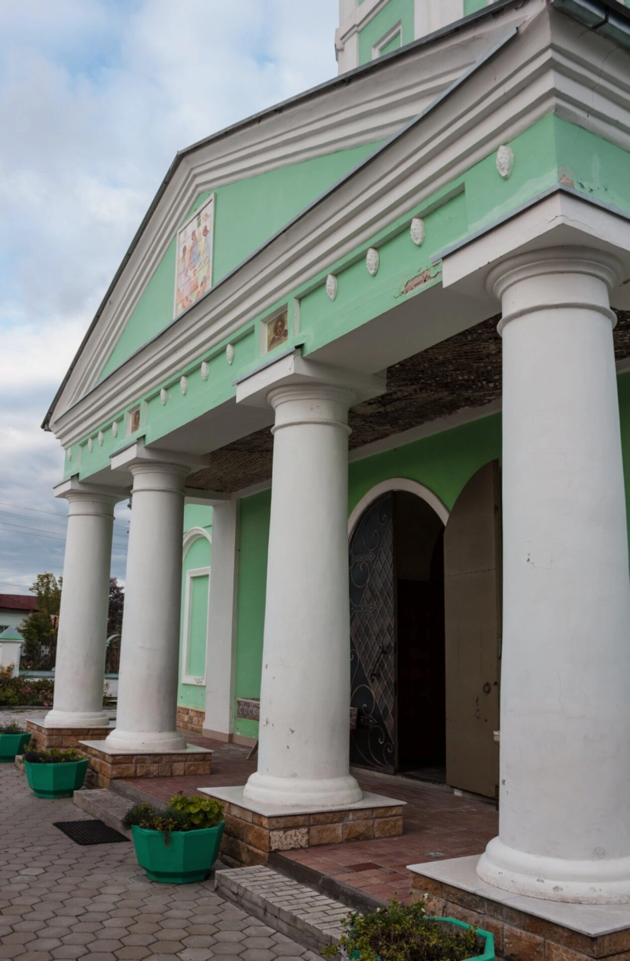 Главный фасад церкви украшает монументальный портик, состоящий из четырёх белоснежных колонн, выполненных в строгом дорическом ордере. Колонны поддерживают треугольный фронтон, создавая классический и благородный архитектурный облик. Основной цвет фасада — спокойный бирюзовый, символически напоминающий о небесной чистоте и вечной жизни, что гармонично контрастирует с белизной архитектурных элементов.