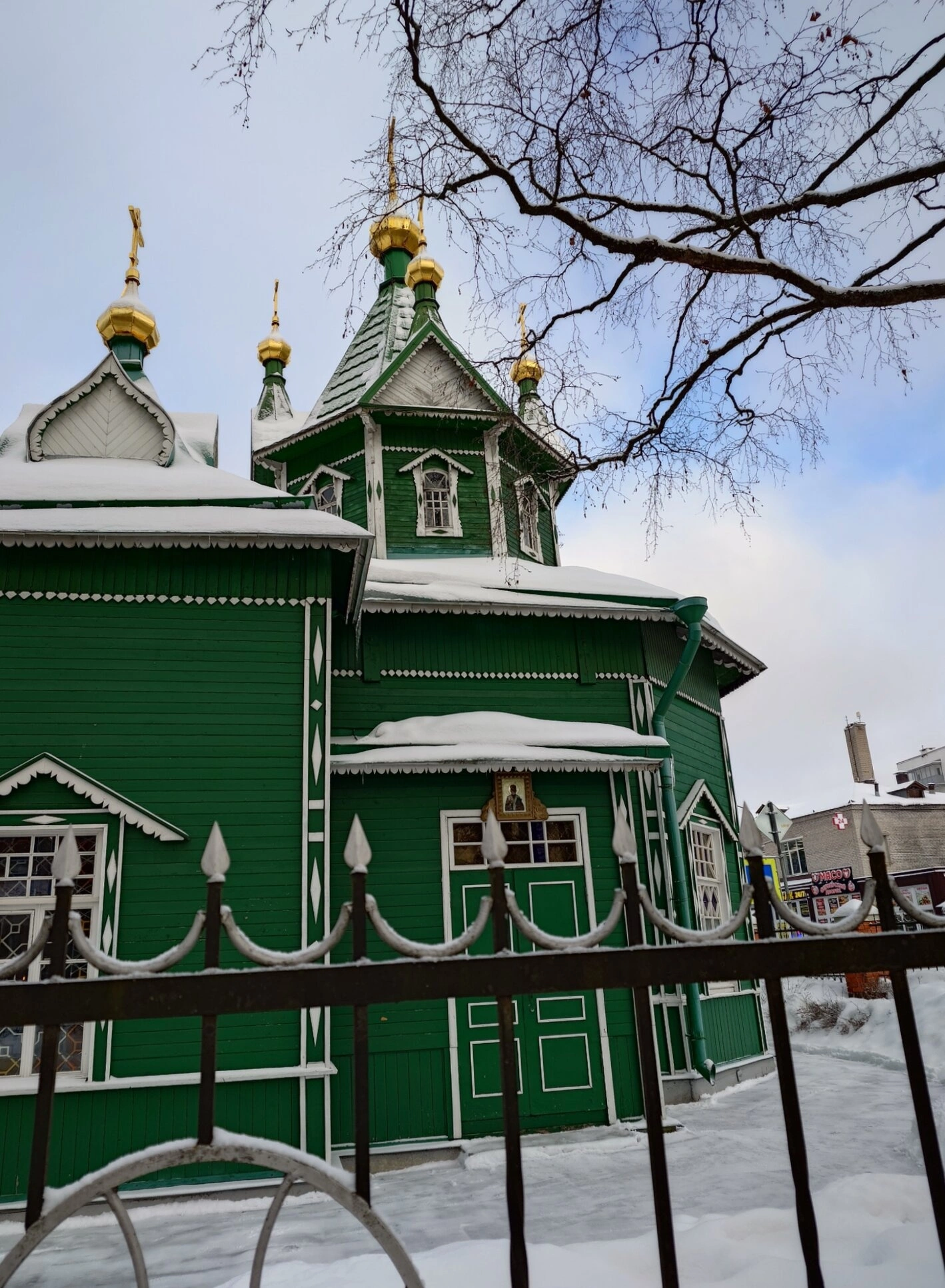 Деревянный храм, окрашенный в тёплый зелёный цвет и украшенный белоснежными декоративными элементами и резными наличниками, сияет на фоне заснеженного пейзажа. Золотистые купола, венчаемые священными крестами, устремляются к небесам, символизируя молитвенное горение и духовную связь земного с горним. Чёрная ажурная ограда отделяет святыню от мирской суеты, подчёркивая особый статус этого места.