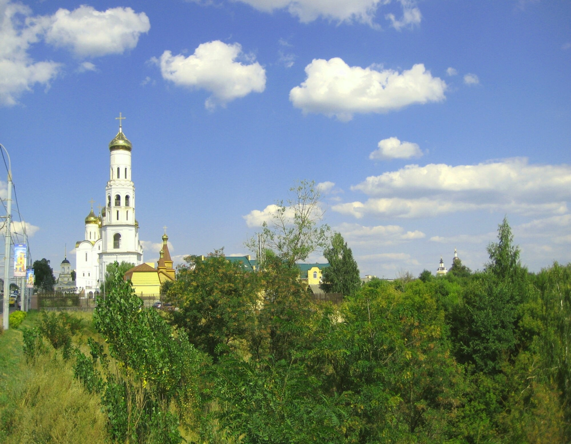 На представленной фотографии запечатлён величественный Свято-Троицкий кафедральный собор, являющийся одной из главных духовных доминант города Брянска. Белоснежные стены храма, символизирующие чистоту и святость, устремляются ввысь, увенчанные сияющими на солнце золотыми куполами. Каждый купол, завершающийся православным крестом, напоминает о горнем мире и вечной жизни во Христе.