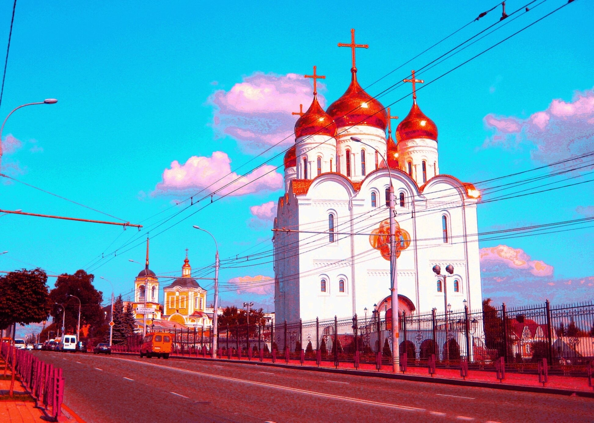 На фотографии запечатлён величественный Свято-Троицкий кафедральный собор, являющийся одной из главных духовных доминант города Брянска. Белоснежные стены храма и сияющие на солнце золотые купола, увенчанные священными крестами, создают образ неземной красоты и благодати. Собор гармонично вписан в городской ландшафт, располагаясь в непосредственной близости от оживлённой транспортной магистрали, что символизирует неразрывную связь духовной жизни с повседневным бытием.