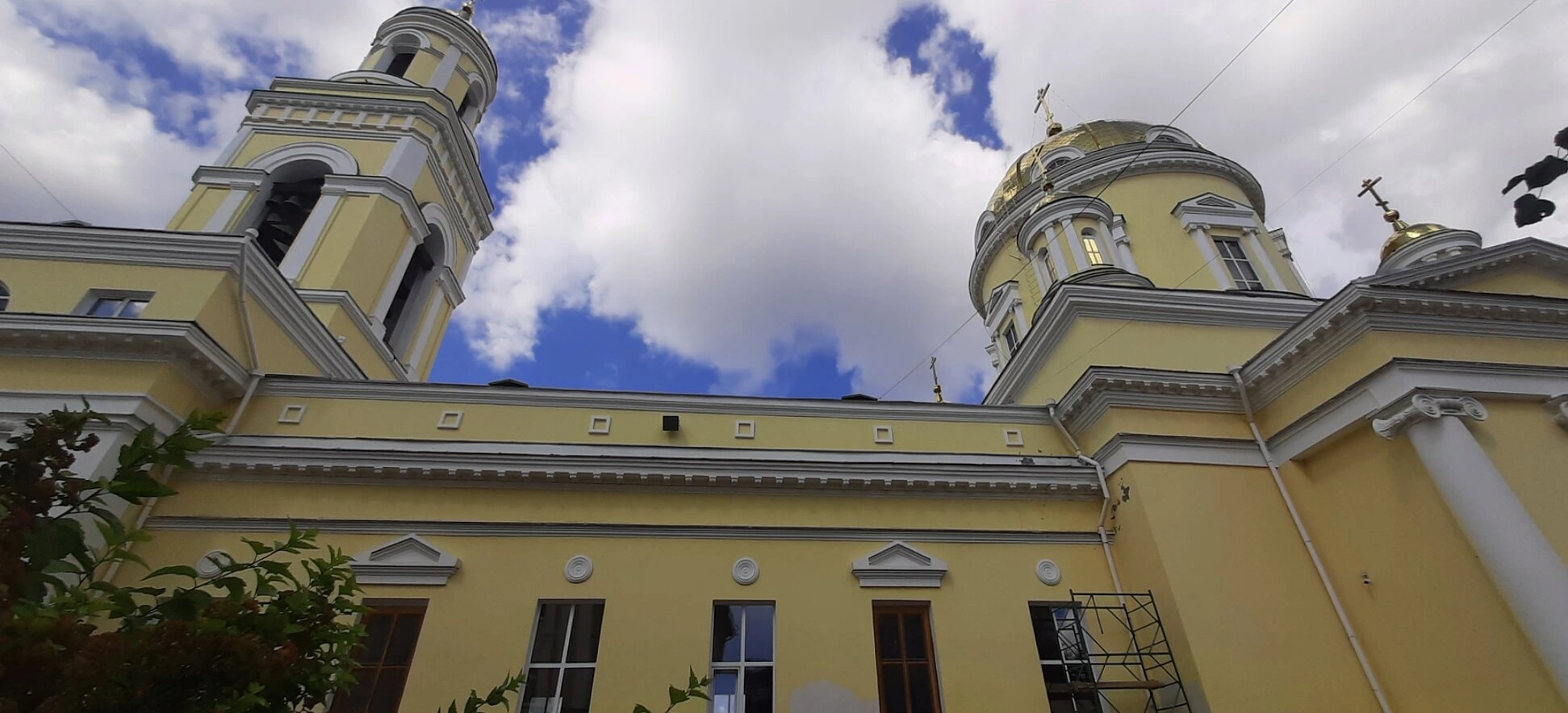 Над центральной частью собора возвышается массивный золоченый купол, увенчанный православным крестом. Отдельного внимания заслуживает многоярусная колокольня, также завершающаяся золоченой главой. Арочные оконные проемы украшены изящными белыми наличниками, а под карнизом размещены декоративные элементы, характерные для храмовой архитектуры XIX века.