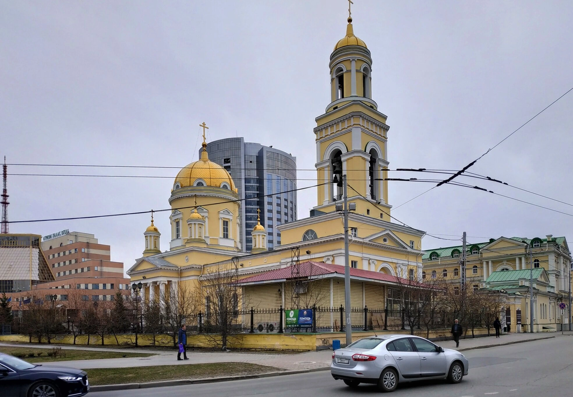Собор окружен невысокой оградой, отделяющей священное пространство от мирской суеты. Перед храмом проходит городская улица с автомобильным движением, а на заднем плане виднеются современные высотные здания, создающие временной контраст с историческим обликом православной святыни. На переднем плане заметны провисающие провода, вероятно, принадлежащие троллейбусной контактной сети.