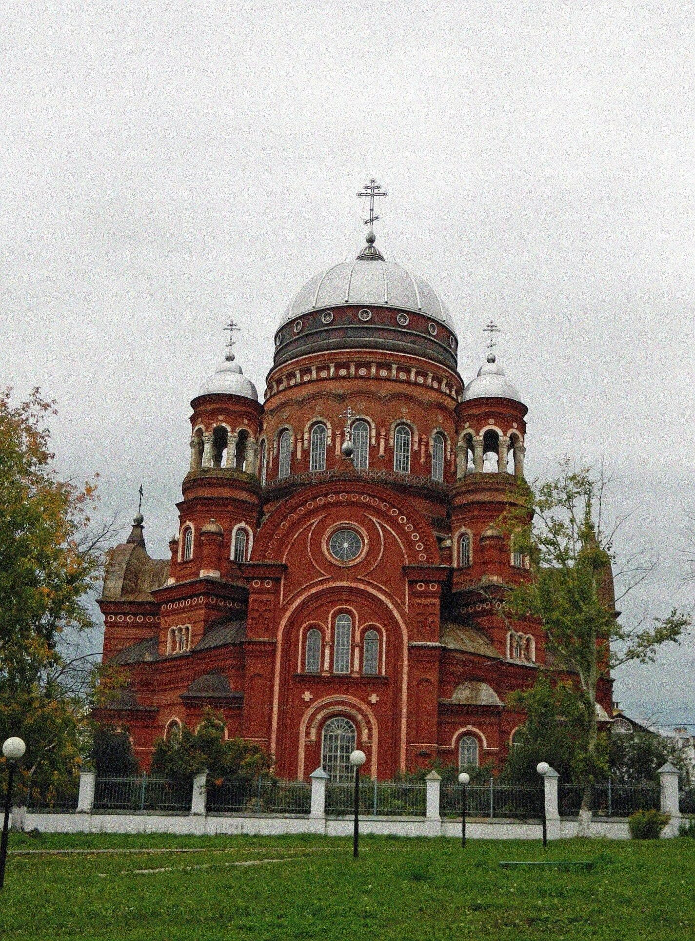 На представленной фотографии запечатлён величественный Свято-Троицкий кафедральный собор, расположенный в историческом центре города Уржума Кировской области. Этот православный храм, являющийся архитектурной доминантой и духовным центром всего Уржумского района, предстаёт перед зрителем во всём своём благолепии.