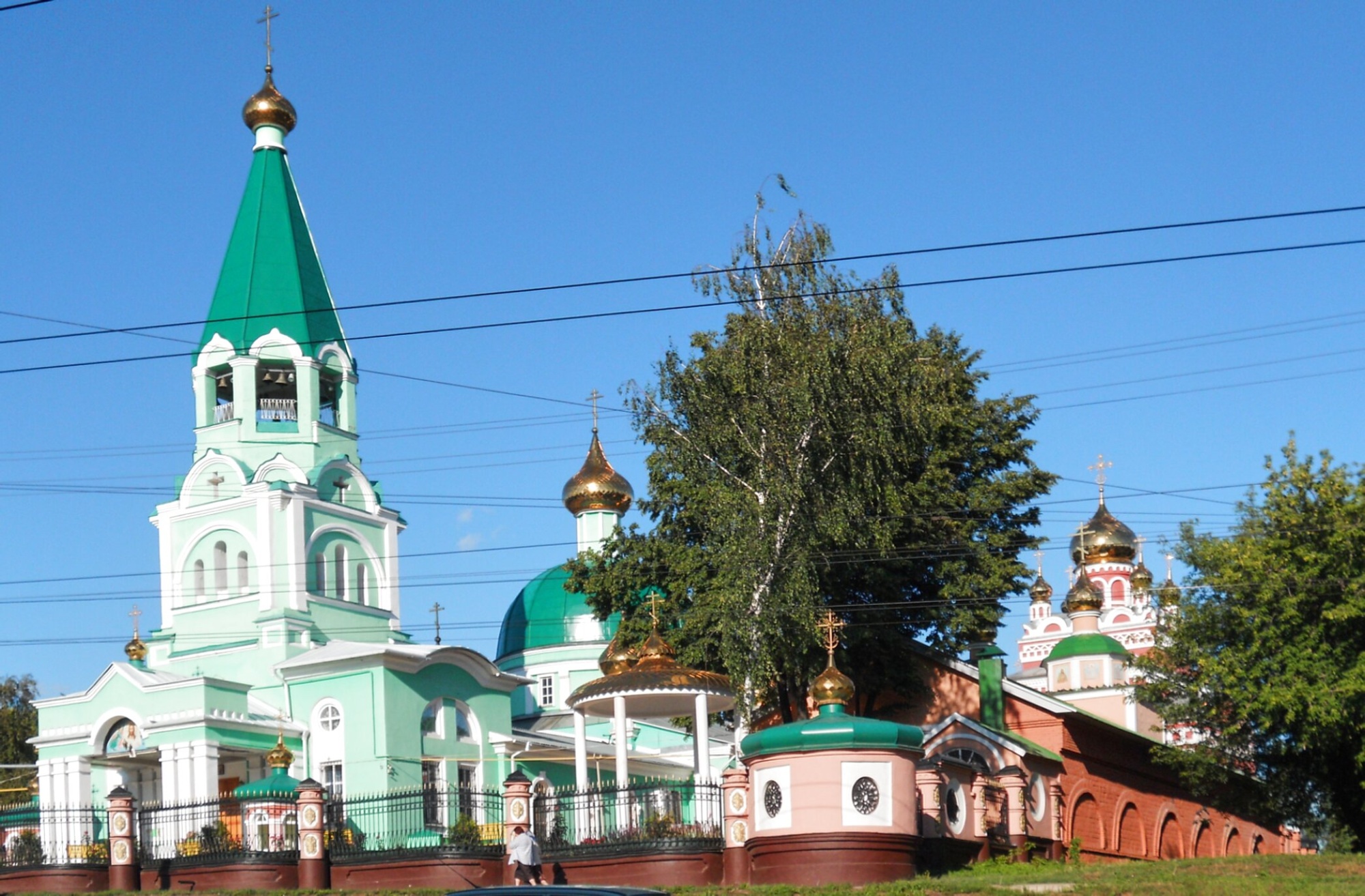 Вокруг собора виден зелёный пояс деревьев, что создаёт ощущение уединённости и покоя, свойственного святым местам. На переднем плане можно заметить элементы церковной ограды и частично прихожан, что передаёт масштаб сооружения и его жиую связь с паствой. Собор является не только архитектурным памятником, но и действующим духовным центром, где ежедневно совершаются богослужения и возносятся молитвы ко Пресвятой Троице.