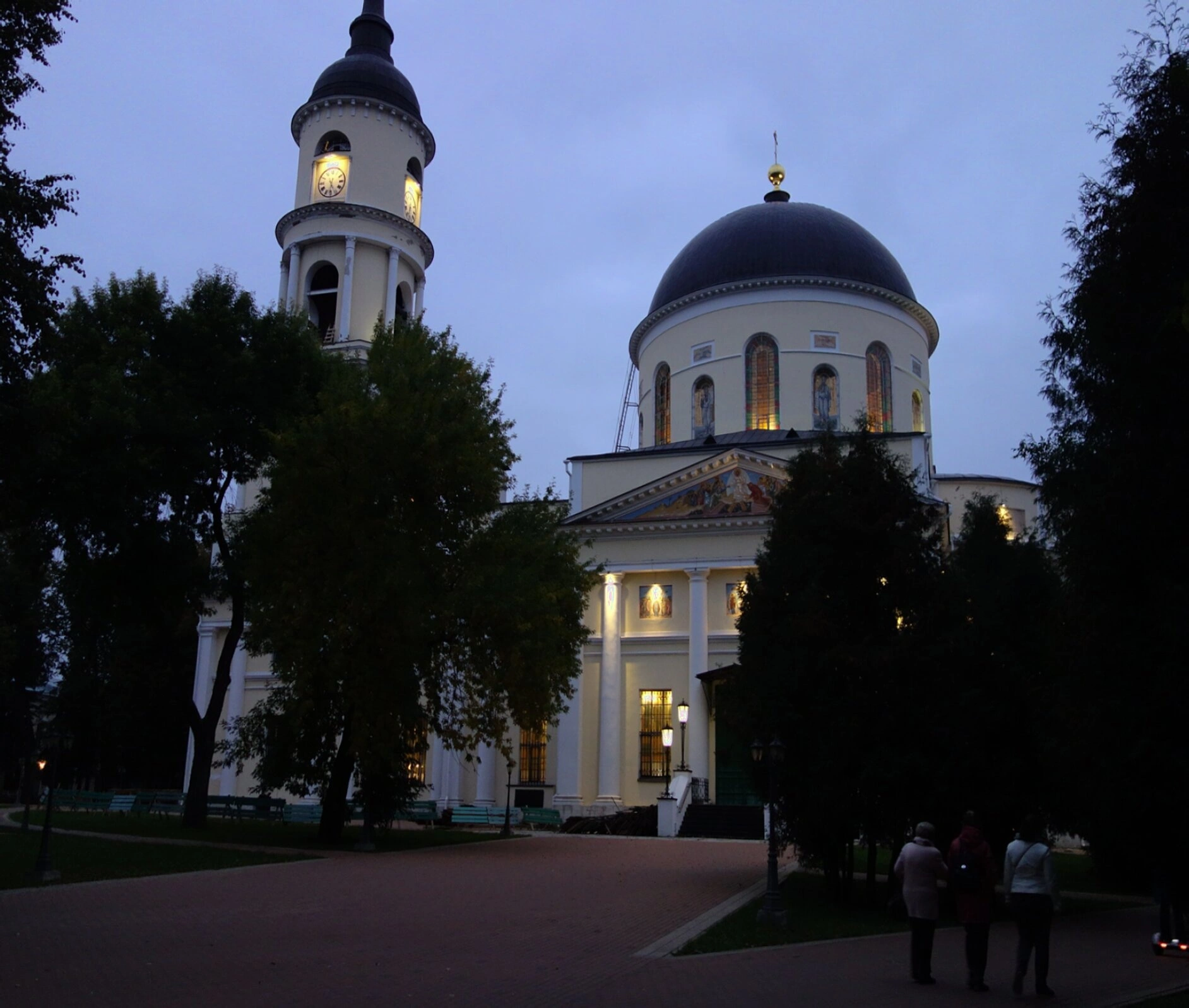 На представленной фотографии запечатлён Свято-Троицкий кафедральный собор, являющийся главным православным храмом Калужской епархии. Снимок сделан в период сумерек, когда включается искусственная подсветка, мягко освещающая величественные стены святыни и подчёркивающая монументальность её архитектурных форм. На фоне тёмного невода собор предстаёт как символ незыблемости православной веры на калужской земле.