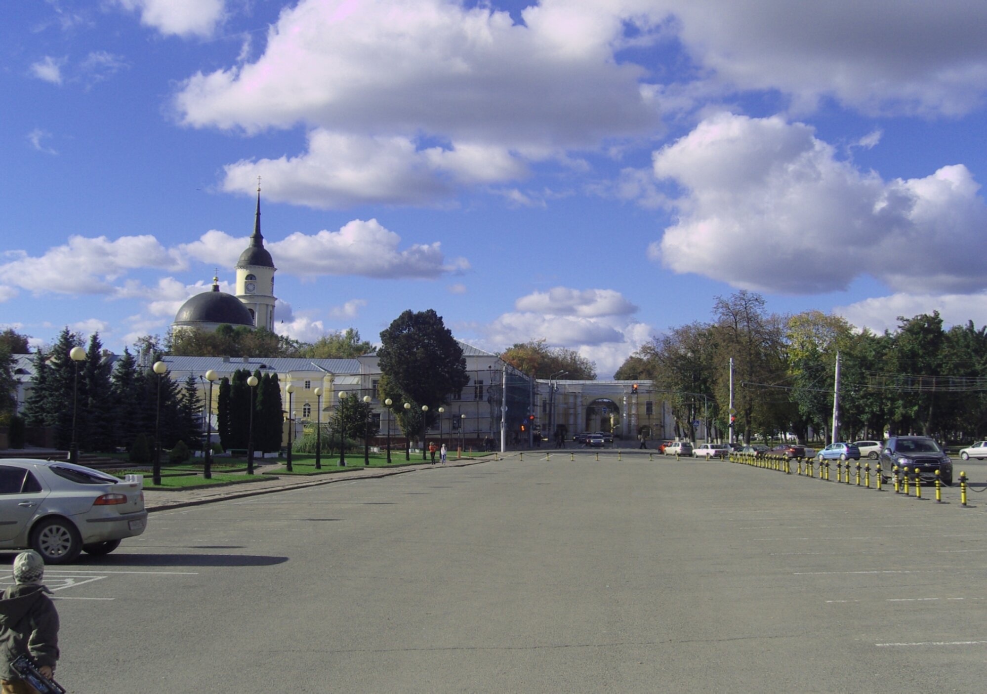 На фотографии запечатлён величественный вид на Свято-Троицкий кафедральный собор, являющийся одной из главных духовных доминант города Калуги. Храм располагается в историческом центре города, на просторной площади, что подчёркивает его архитектурную значимость и создаёт ощущение простора и величия.