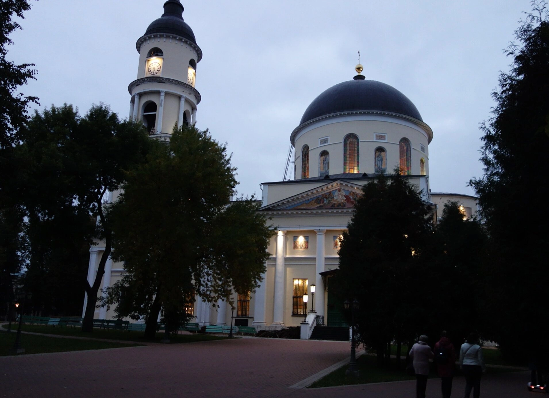 На переднем плане фотографии видны прогулочные дорожки и деревья сквера, окружающего собор. Неспешно идущие люди подчёркивают масштаб и монументальность архитектурного сооружения. Вечерняя иллюминация не только делает собор узнаваемым символом города, но и подчёркивает его сакральный статус, приглашая верующих к молитве и созерцанию духовной красоты.