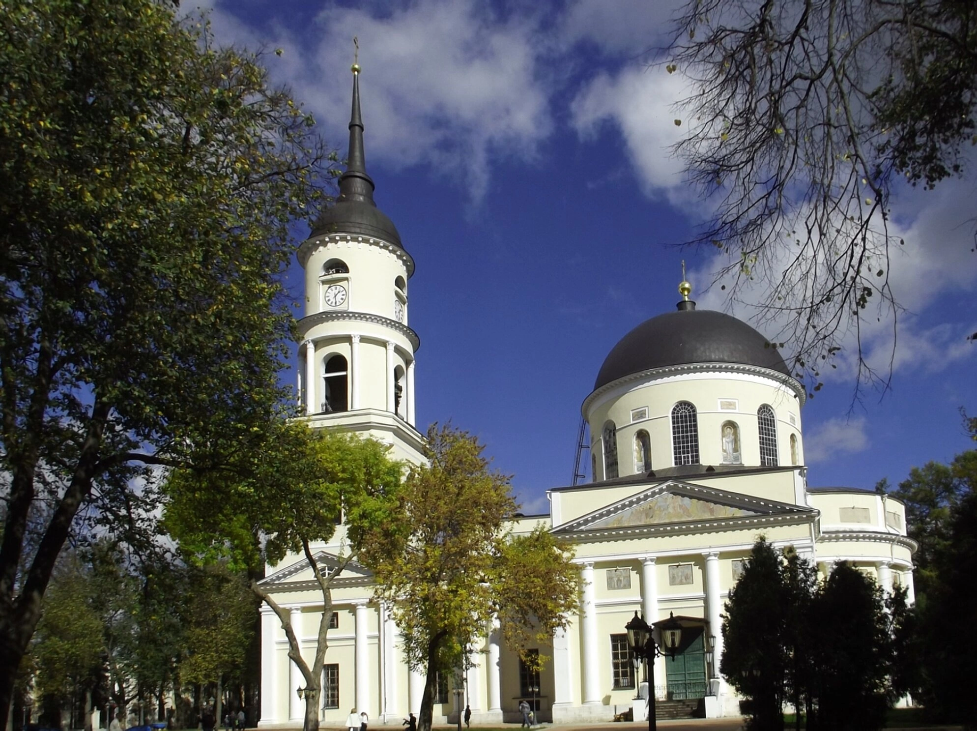 На представленной фотографии запечатлён величественный Свято-Троицкий кафедральный собор, являющийся архитектурной доминантой и одной из главных духовных святынь города Калуги. Собор расположен в историческом центре города, на территории бывшей Калужской крепости.