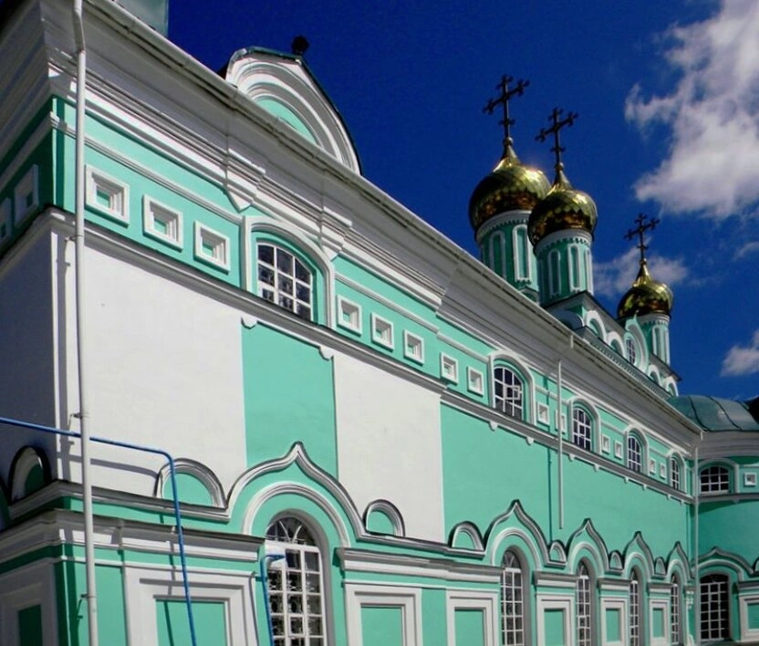 Собор освящён в честь Святой Живоначальной Троицы и представляет собой выдающийся образец русского церковного зодчества. Белоснежный фасад, украшенный изящными пилястрами, резными карнизами и наличниками, эффектно сочетается с нежным светло-зелёным цветом стен, создавая ощущение торжественности и чистоты. Арочные оконные проёмы добавляют облику храма лёгкость и устремлённость ввысь.