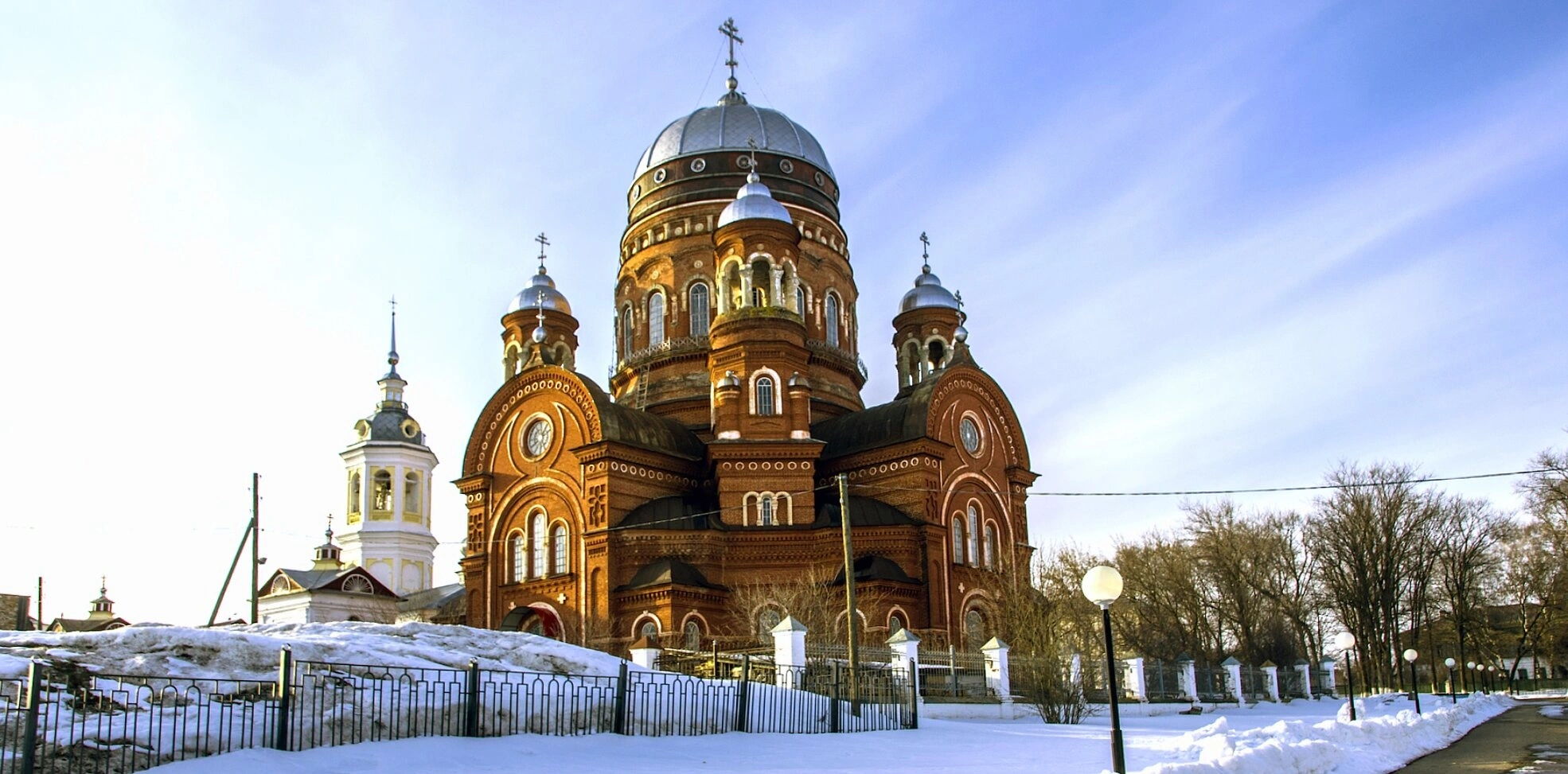 На представленной фотографии запечатлён величественный Свято-Троицкий кафедральный собор, расположенный в городе Уржуме Кировской области. Этот православный храм, являющийся архитектурной доминантой и духовным центром города, воплощает в себе многовековые традиции русского церковного зодчества.