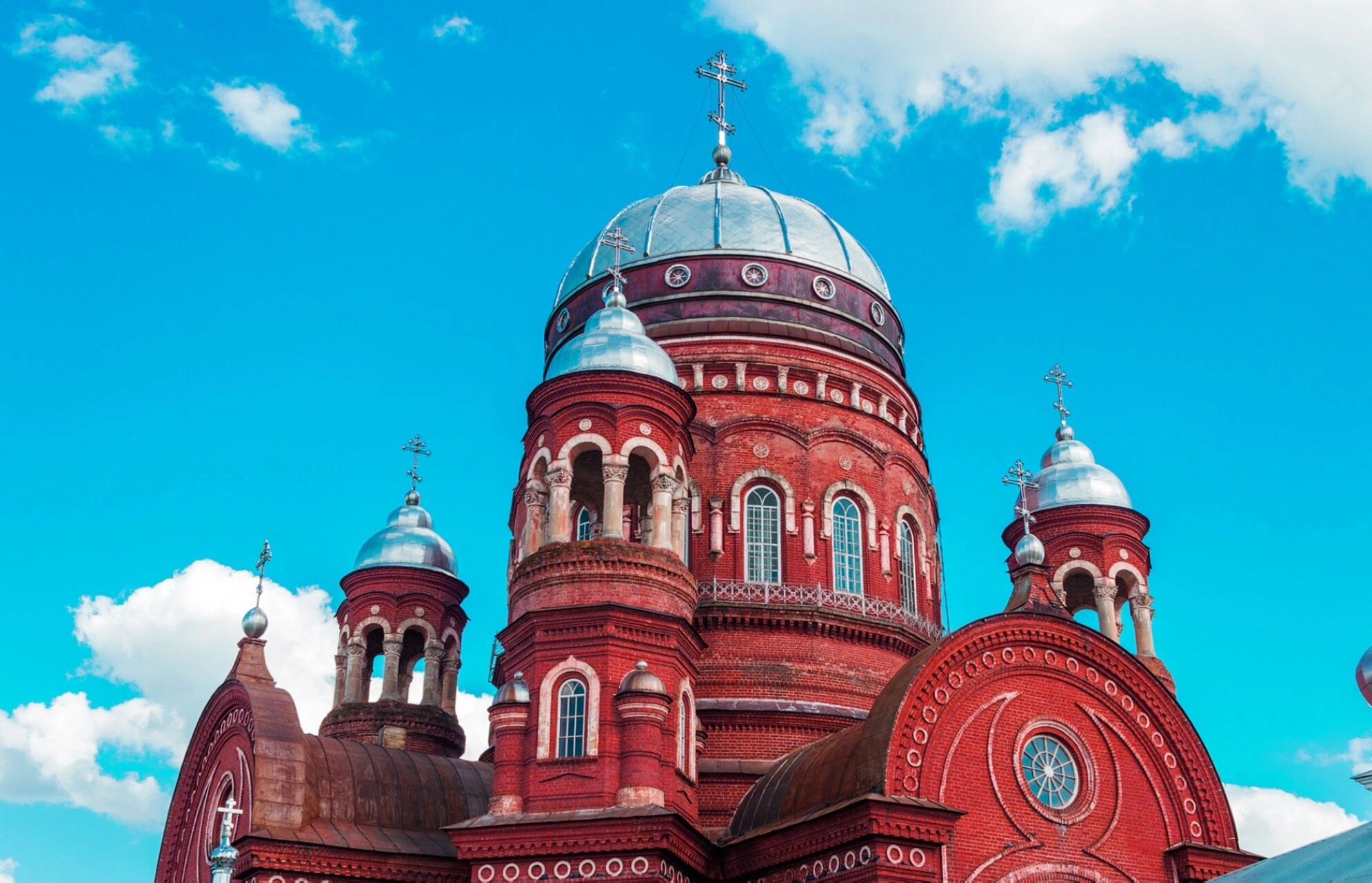 На представленной фотографии запечатлён величественный Свято-Троицкий кафедральный собор, расположенный в историческом центре города Уржума Кировской области. Этот православный храм, по праву считающийся духовной жемчужиной Вятской земли, является выдающимся памятником церковной архитектуры и центром религиозной жизни города.