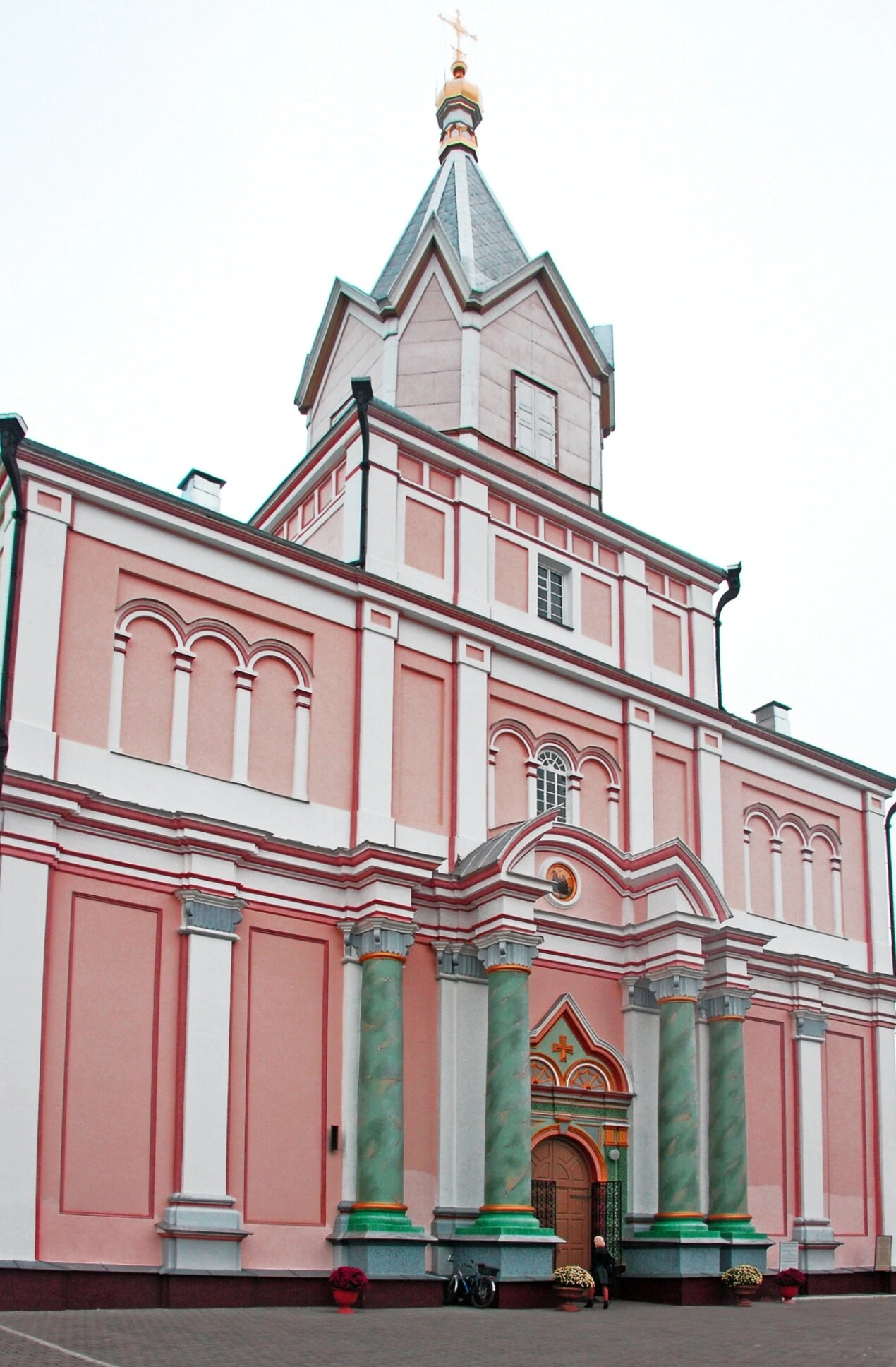 Архитектурный ансамбль монастыря включает в себя Свято-Троицкий собор, колокольню и другие monastic постройки, окружённые крепостными стенами. На фотографии можно видеть прекрасный образец церковной архитектуры, сочетающий традиции православного зодчества с местными особенностями. Белоснежные стены храма, увенчанные зелёными куполами с золотыми крестами, создают образ небесного града на земле.