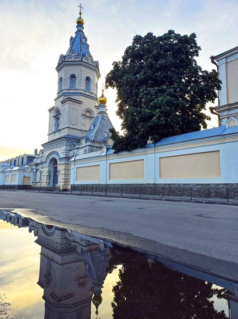 Особую выразительность фотографии придаёт отражение монастырских строений в луже на переднем плане, что добавляет кадру не только художественной глубины, но и символического звучания, напоминая о отражающейся в вечности красоте горнего мира. Монастырь известен своей чудотворной Корецкой иконой Божией Матери, именуемой «Споручница грешных», которая является главной святыней обители и почитается верующими за множество исцелений и чудес.