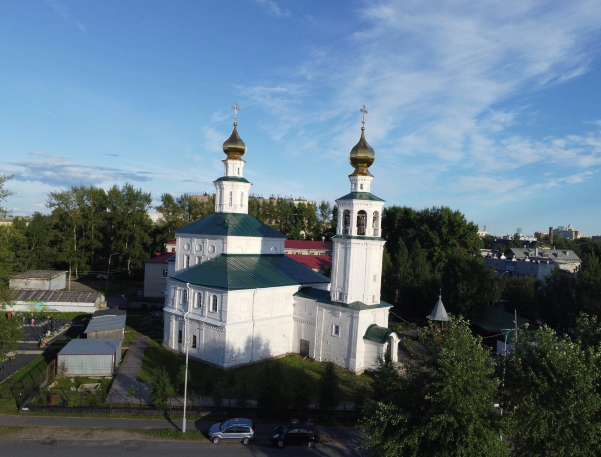На представленной фотографии запечатлён Свято-Троицкий храм, известный также как Кузнечевская церковь, — один из старейших православных храмов Архангельска. Снимок выполнен с высоты птичьего полёта, что позволяет в полной мере оценить величественность архитектурного ансамбля и его гармоничное единство с окружающим пространством.